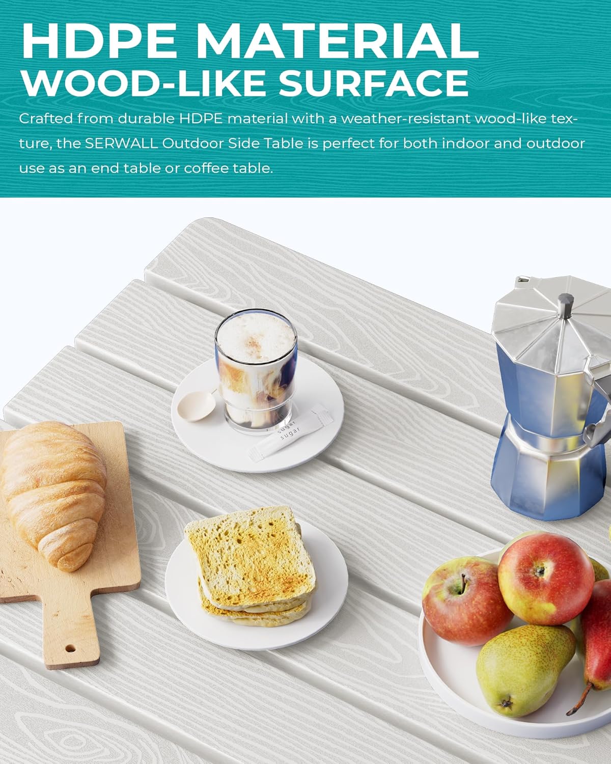 - [Premium Wood-Textured Surface] Offering the aesthetic appeal of wood without the upkeep, the SERWALL Side Table features a wood-textured HDPE surface that adds an elegant and natural touch to your outdoor decor.