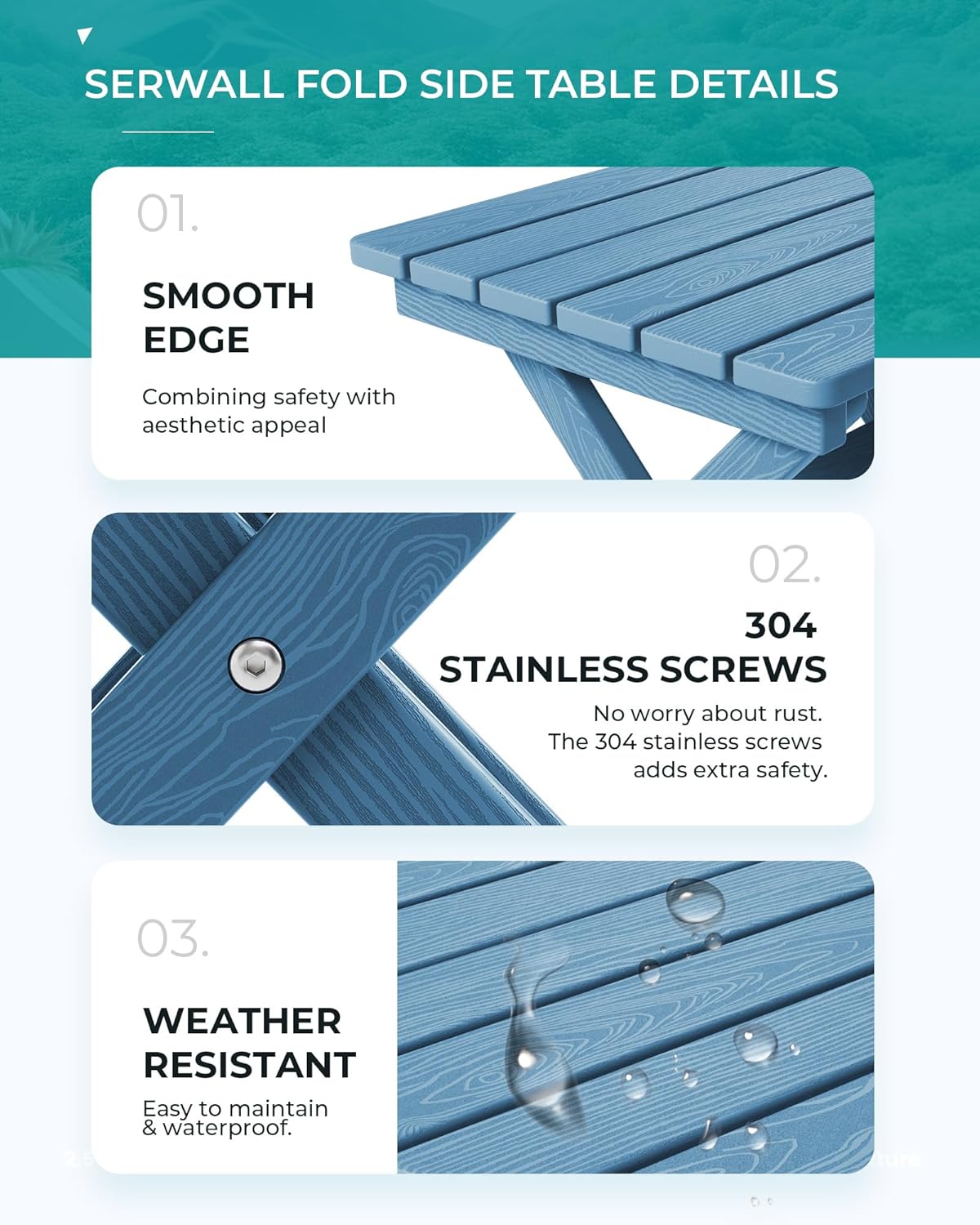 - [Ready-to-Use Convenience] Unbox your SERWALL Adirondack Side Table and enjoy immediate functionality. This folding end table is designed for hassle-free setup, perfect for those seeking a no-assembly-required experience.