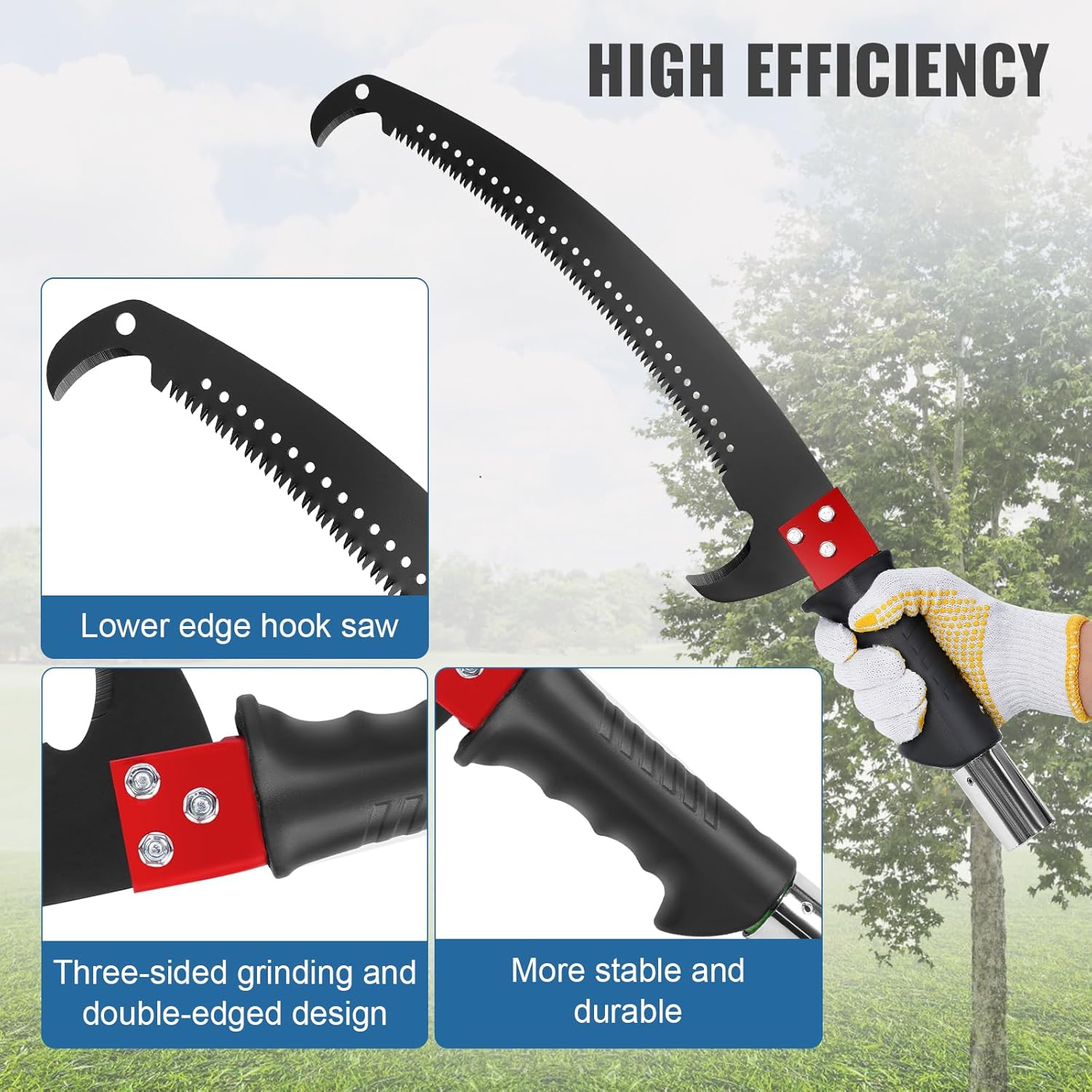 - Double Hook Saw Design: it adopts double hook design, the upper hook knife can break the thin twigs, the bottom hook saw can remove the connected twig, which can saw off 10cm twigs