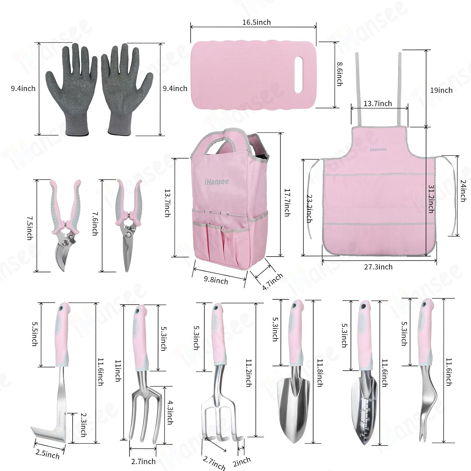Pink Garden Tool Sets 12 Pieces, iHansee Aluminum Gardening Hand Tools with Non-Slip Handle, Kneeling Pad, Apron, Gloves and Organizer Bag, Landscaping Tools - Gift for Women & Garden Enthusiasts