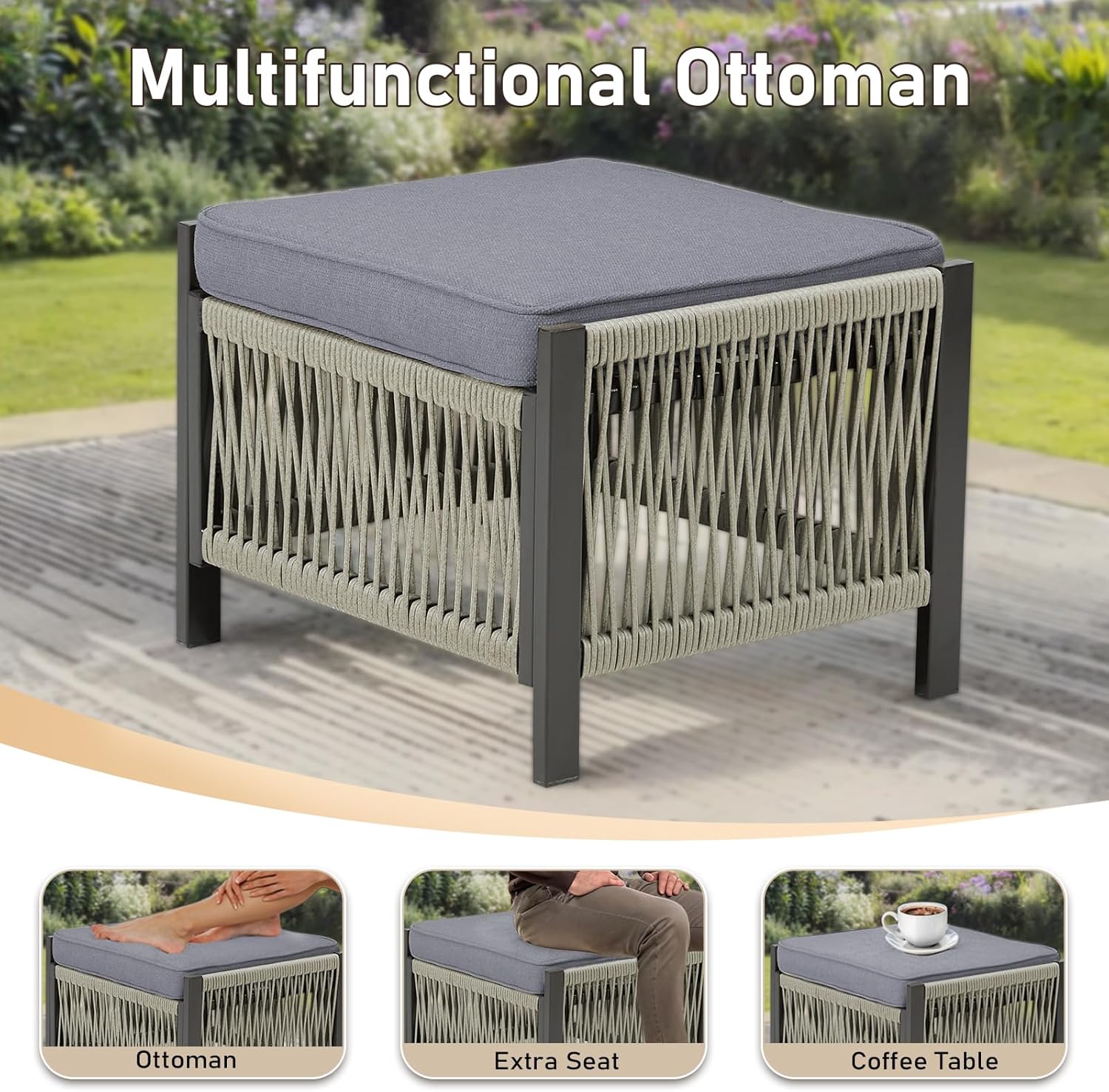 - Modern Minimalist Design: This modern outdoor furniture set stands out with its minimalist design, combining faux rope rattan and exposed metal tubing for a sleek look. Unlike the bulky full-width rattan designs, this set offers a lighter, more refined aesthetic. The contrast between the exposed tubing and the rattan color adds a contemporary touch to any outdoor patio furniture set