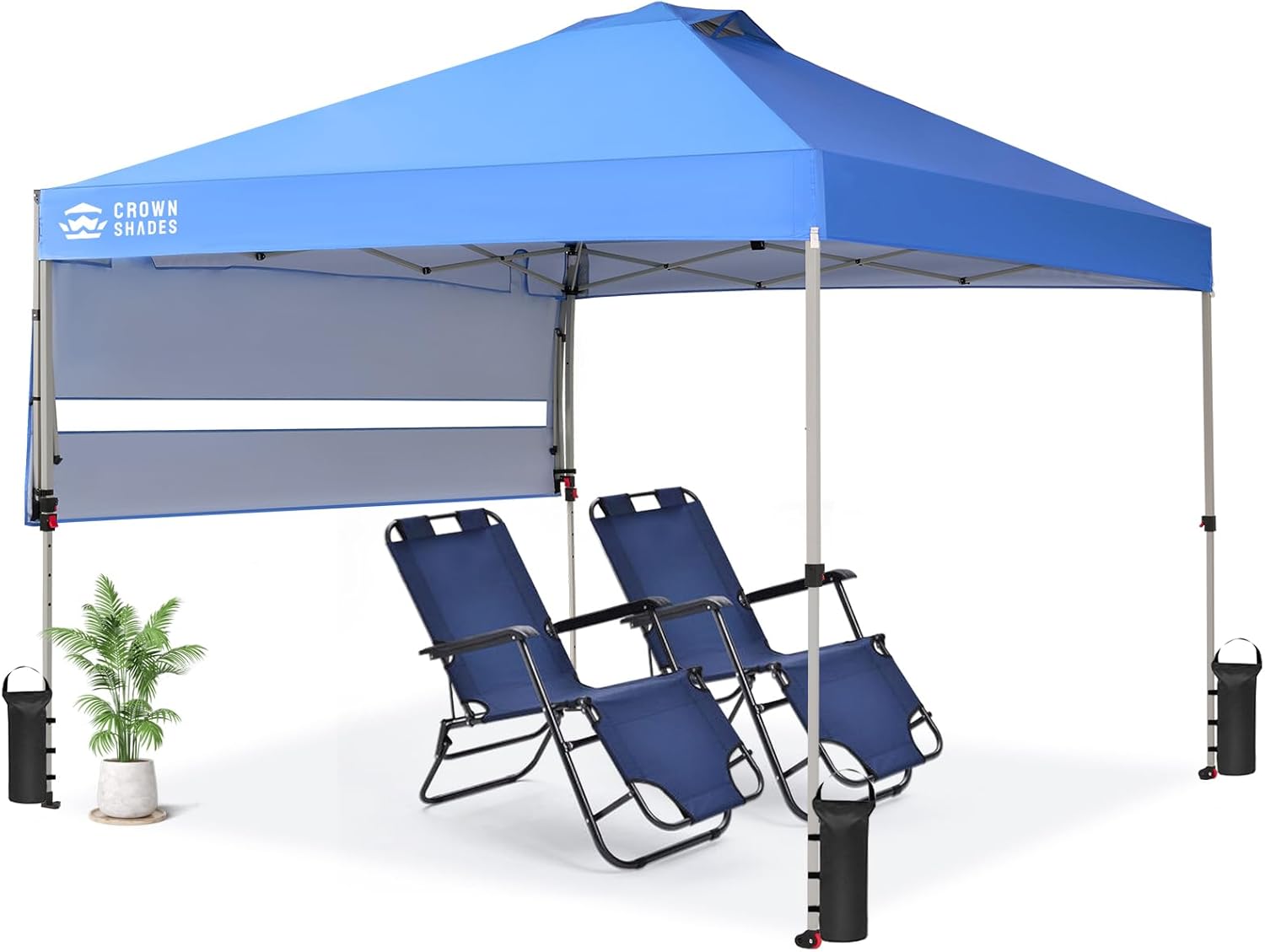 CROWN SHADES 10x10 Pop up Canopy Tent, Instant Commercial Canopy with Extend Awning, Patended Centerlock, 150D Silver Coated Fabric, 4 Ropes, 8 Stakes, 4 Weight Bags, STO 'N Go Bag, Blue