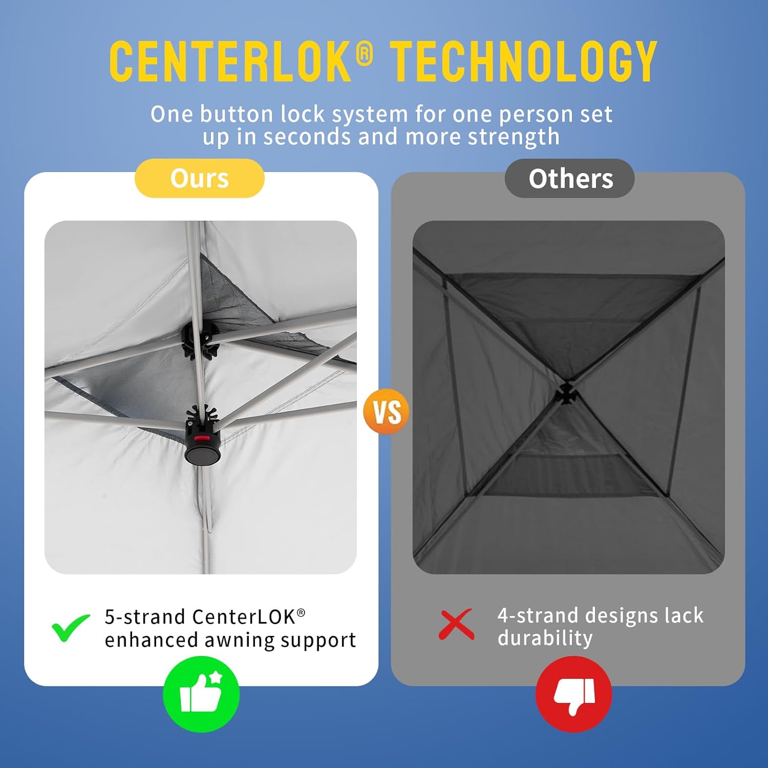 - EASIEST SET UP: Our canopy tent features patented one-push center lock technology, which securely locks all four poles with a single push at the central hub. Then, use the soft, pinch-free buttons to adjust the leg height from 3 positions. You can easily open or close the extendable awning to accommodate different shading requirements