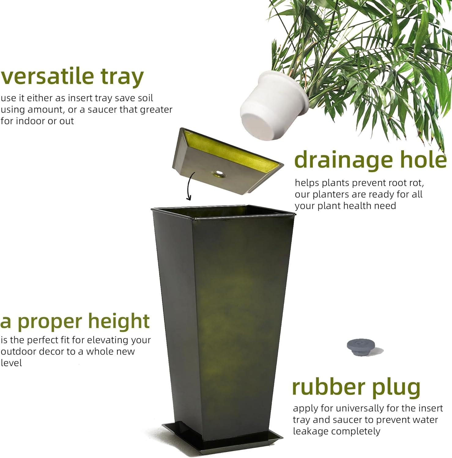 KOL 28''H. Tall Metal Planter with Saucer, Galvanized Steel Glazed Planter Pots with Drainage Hole for Indoor & Outdoor Use, Set of 2, Decorative Flower Plant Pots for Front Porch, Patio, Deck - Green