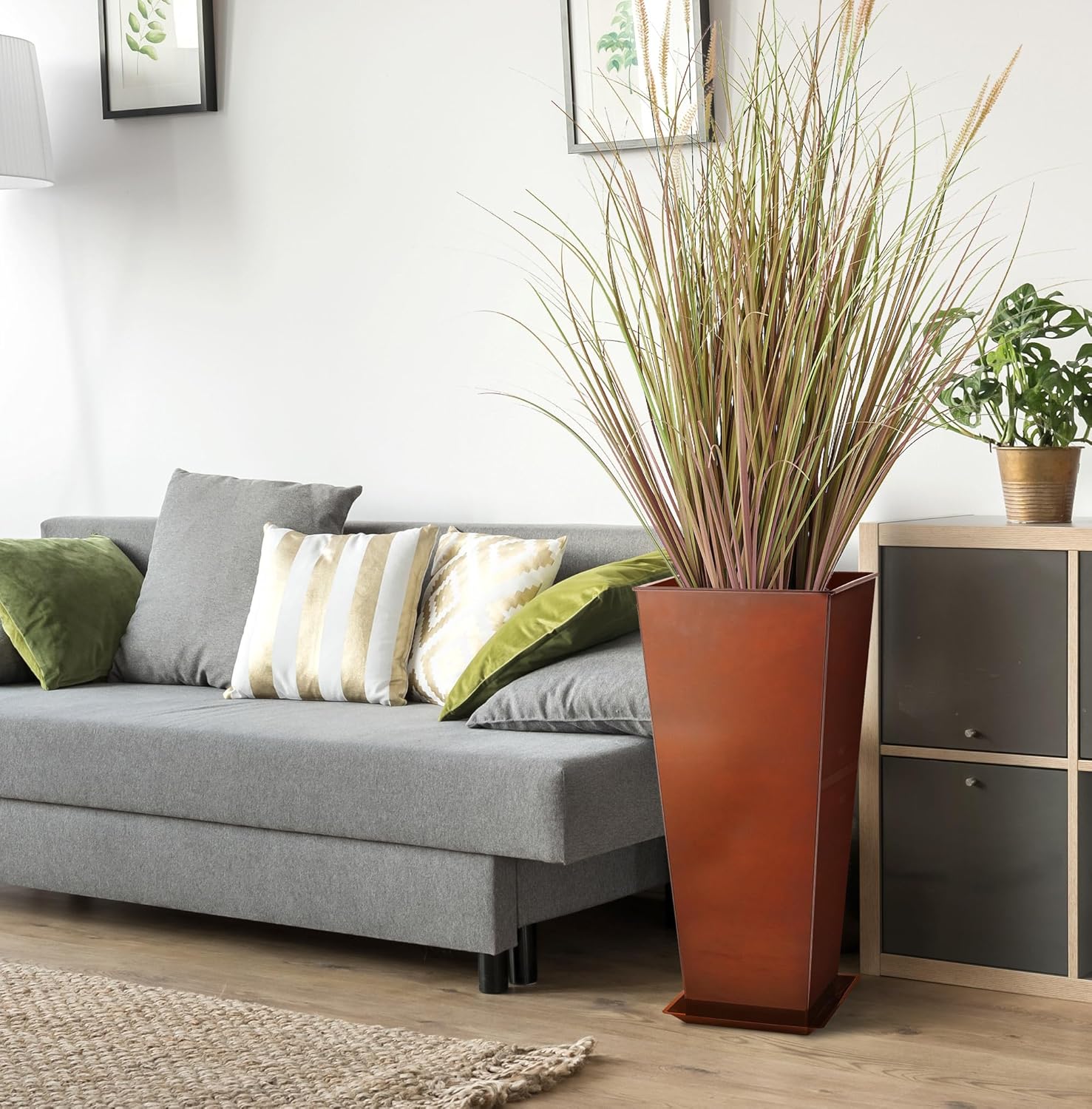 KOL 25''H. Galvanized Steel Planter with Saucer, Tall Glazed Planter Pots for Indoor & Outdoor Use, Set of 2, Decorative Flower Plant Pots with Drainage Hole for Porch, Patio, Deck - Reddish Brown