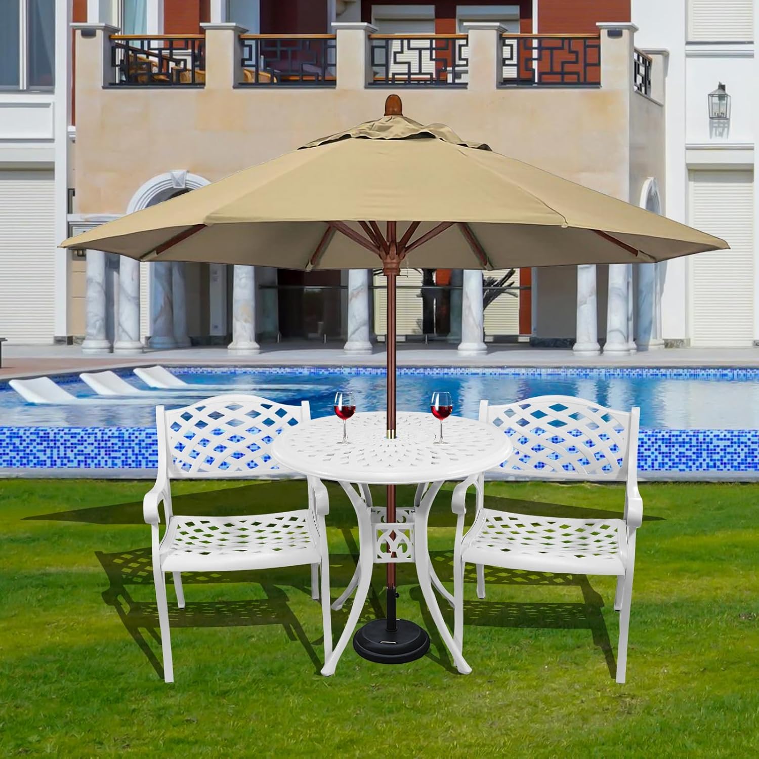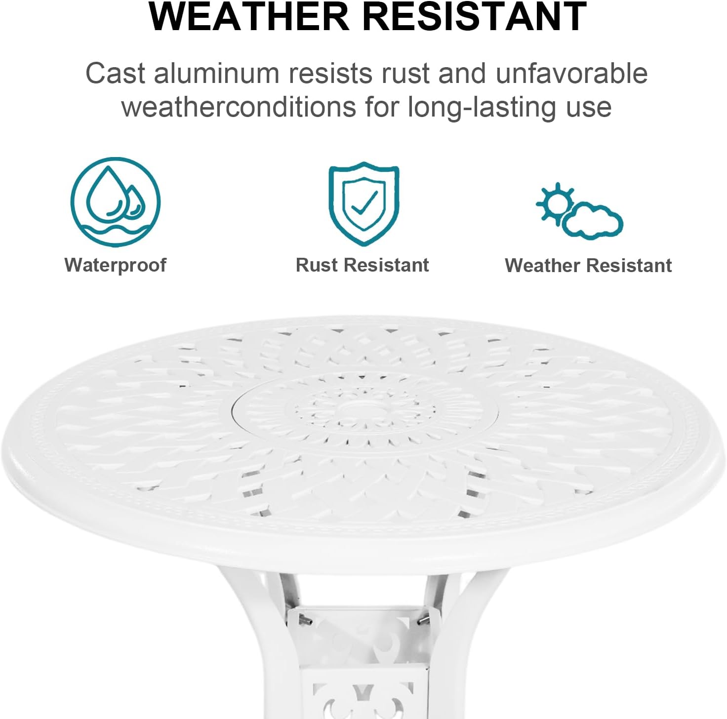 3 Piece Cast Aluminum Bistro Set With Umbrella Hole, Outdoor Patio Furniture With Adjustable Foot Cap, Metal Table and 2 Chairs for Garden, White