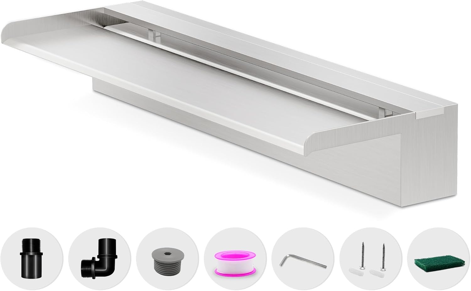 Waterfall Pool Fountain, LONGRUNNEW Stainless Steel Waterfall Spillway with Pipe Connector Kits for Outdoor/Indoor Decorative, 23.6 Inches Pool Water Feature for Garden Patio, Backyard Koi Pond Decor