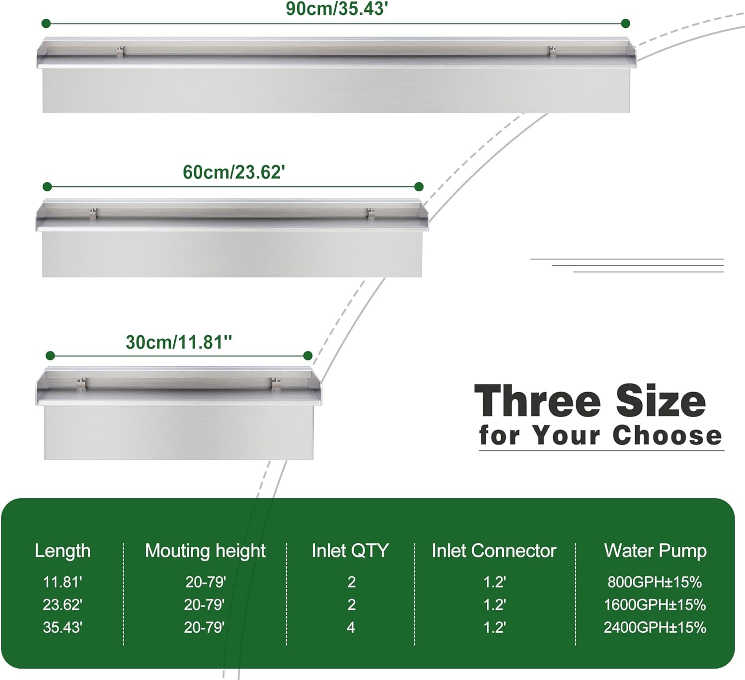 Waterfall Pool Fountain, LONGRUNNEW Stainless Steel Waterfall Spillway with Pipe Connector Kits for Outdoor/Indoor Decorative, 35.4 Inches Pool Water Feature for Garden Patio, Backyard Koi Pond Decor