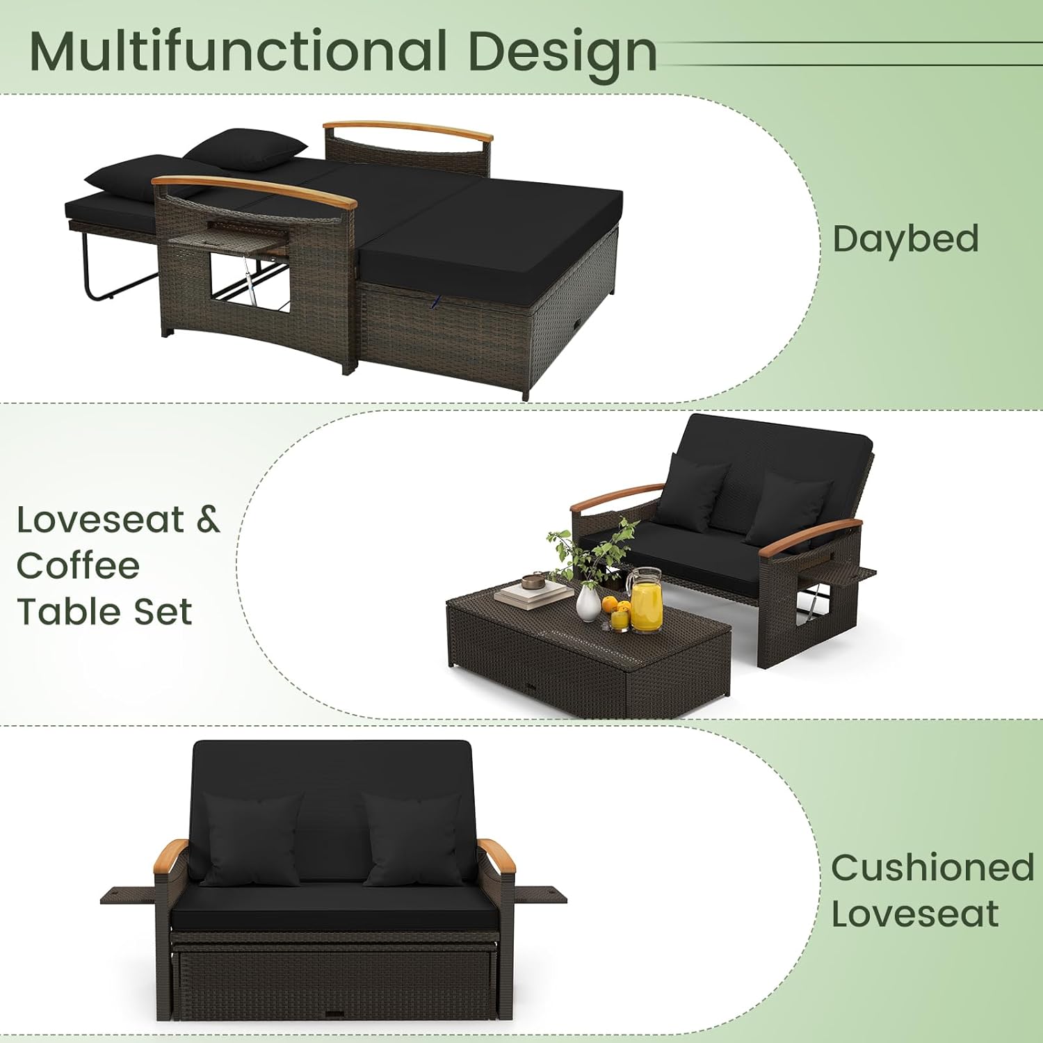 - Multifunctional Design: In addition to using it as a cushioned loveseat, this multi-purpose outdoor furniture set also serves as a daybed or loveseat and coffee table set, greatly meeting your different needs. Loveseat dimension: 31β-47.5β x 66β x 14β-36β (L x W x H). Ottoman dimension: 43.5β x 24β x 12β (L x W x H).