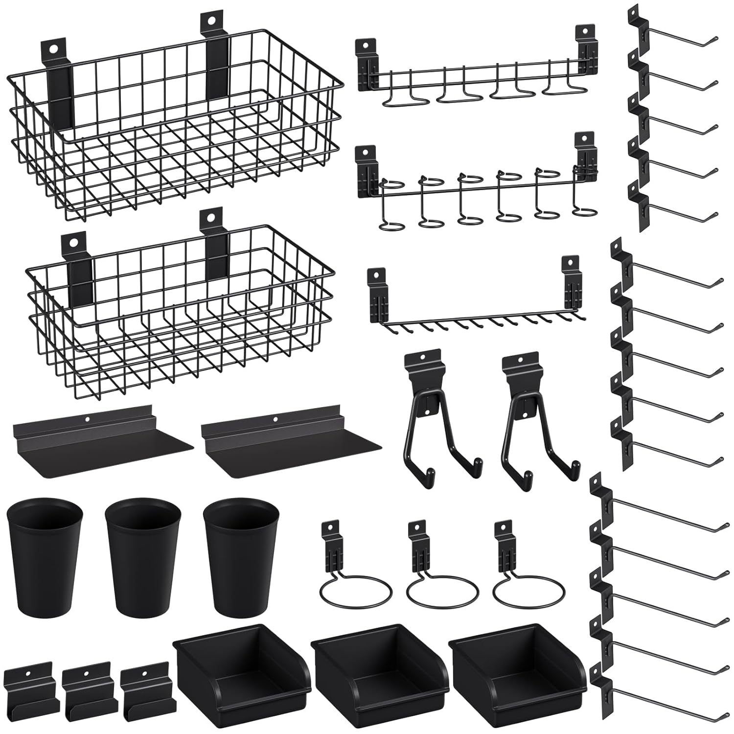 - VALUDED PACKAGE: Our slatwall accessories kit comes with 20pcs multisized slatwall hooks, 2pcs slatwall shelves, 3pcs slatwall bins, 3pcs slatwall cups, 2 pack slat wall baskets size L (12.5”x6.5”x4”) and size XL (13.5”x7.5”x4.5”), which meets your various storage use and replacement needs