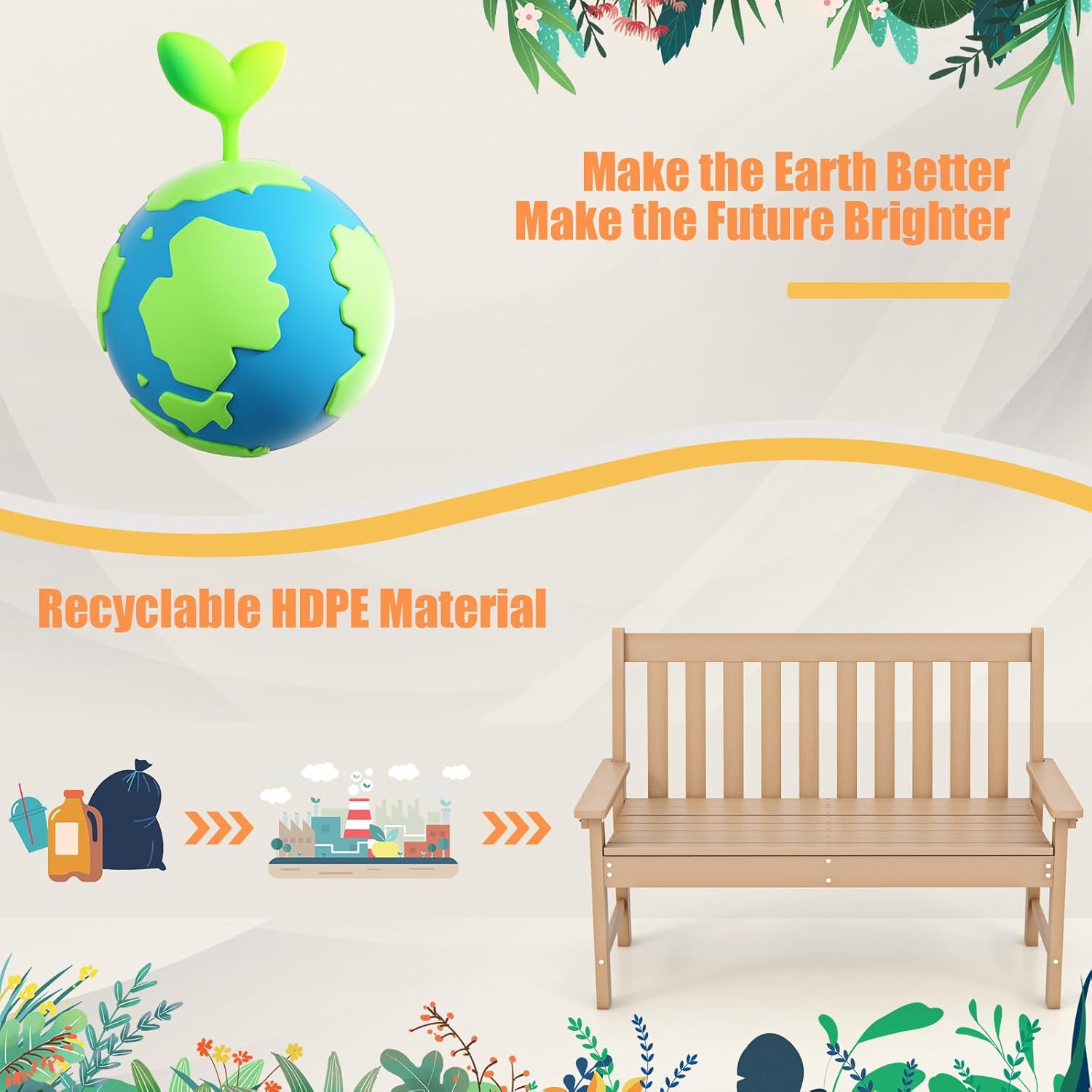 - [Weather-Tough HDPE Material]: Crafted from durable HDPE material, this garden bench is built to withstand the elements. Its weather-resistant, colorfast, and waterproof qualities ensure long-lasting performance outdoors. Plus, it's recyclable, promoting a greener future.