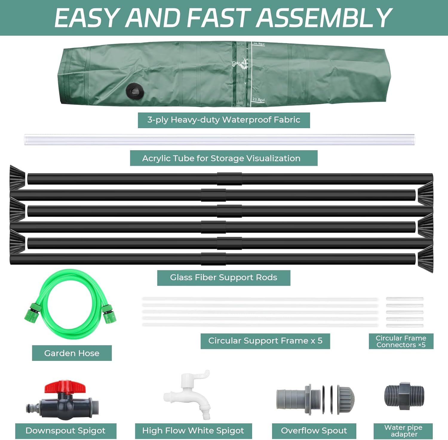 - Superior Stability: Water collection system to collect rainwater from gutterr einforced with Glass fiber Support Rods and a Circular Frame, ensures unrivaled stability. Resistant to extreme weather, rain water collection barrel remains steadfast and upright, preventing any swaying or tipping.
