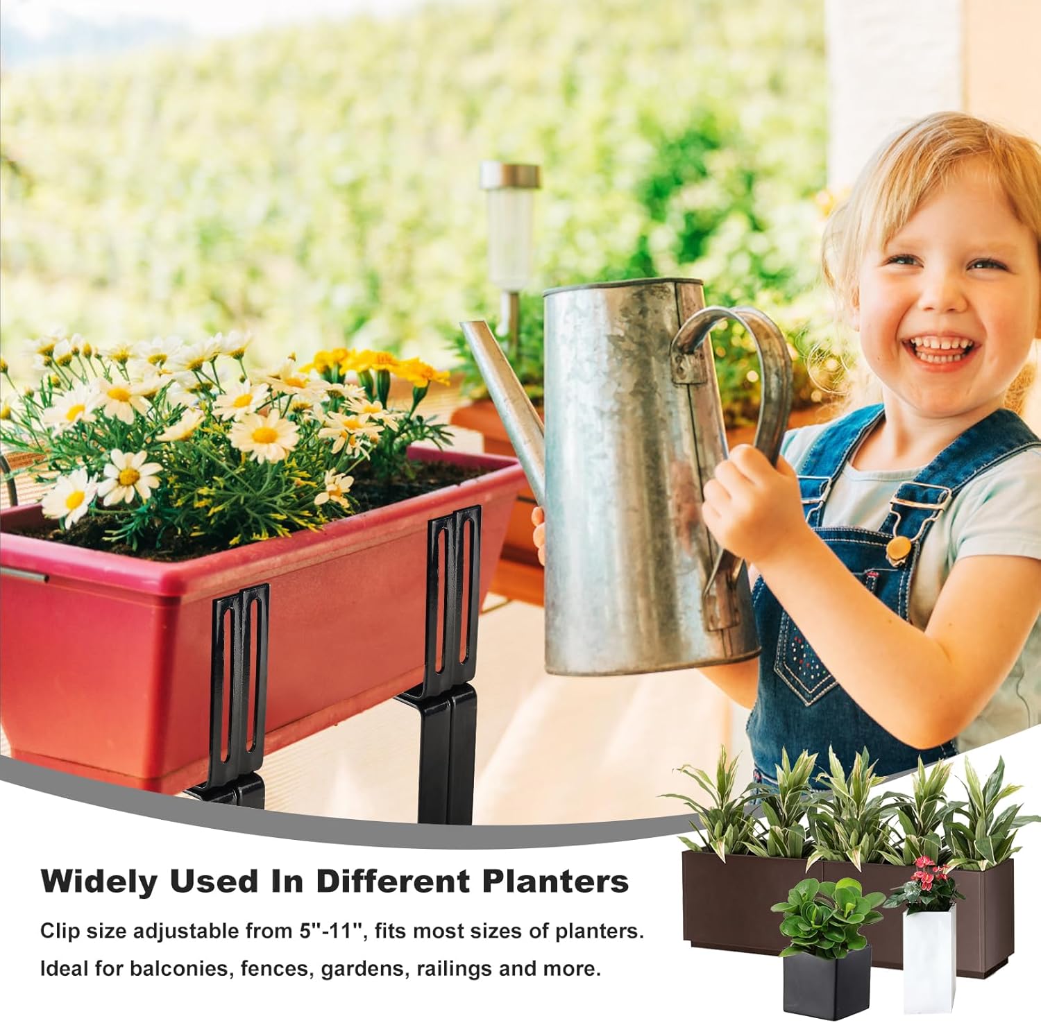 - A Durable and Beautiful Deck Solution: The SAYUUM railing planters have a size of 7 × 6.5 × 1.5 inches. These steel rectangular planter box clips are specifically designed to securely hold your flower pots on top of your deck rails. The two-way clip design ensures that your plants will remain stable and will not easily wobble or fall over