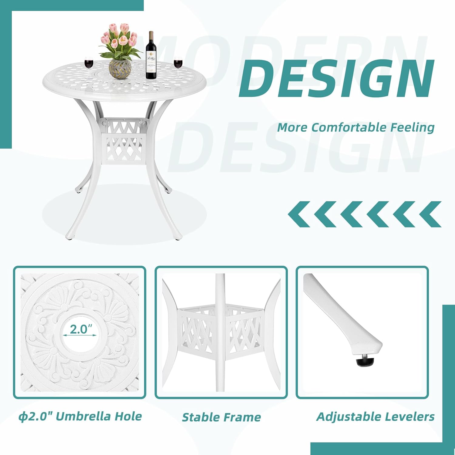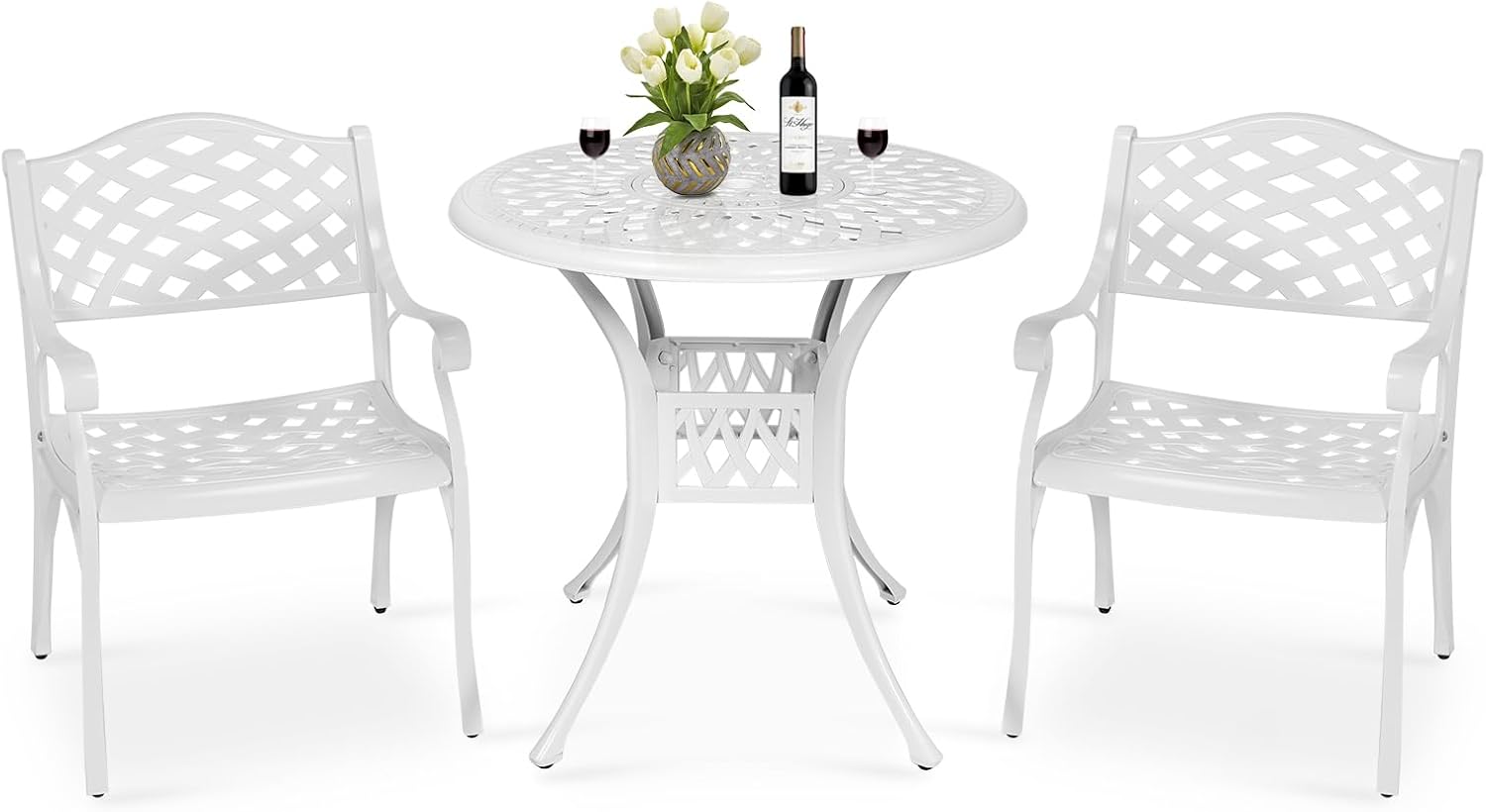 - 【Dimensions】 - Our round table is 31"(Dia) x 29.5"(H), and each of 2 chairs is 22.4"(L) x 23"(W) x 32.5"(H), you’ll love how this furniture set uniquely accents your space. Quickly assemble so you can enjoy it in no time, all hardware, tools and instructions required are included for easy assembly. Over this summer to show off your new, stylish, cast aluminum dining set to everyone