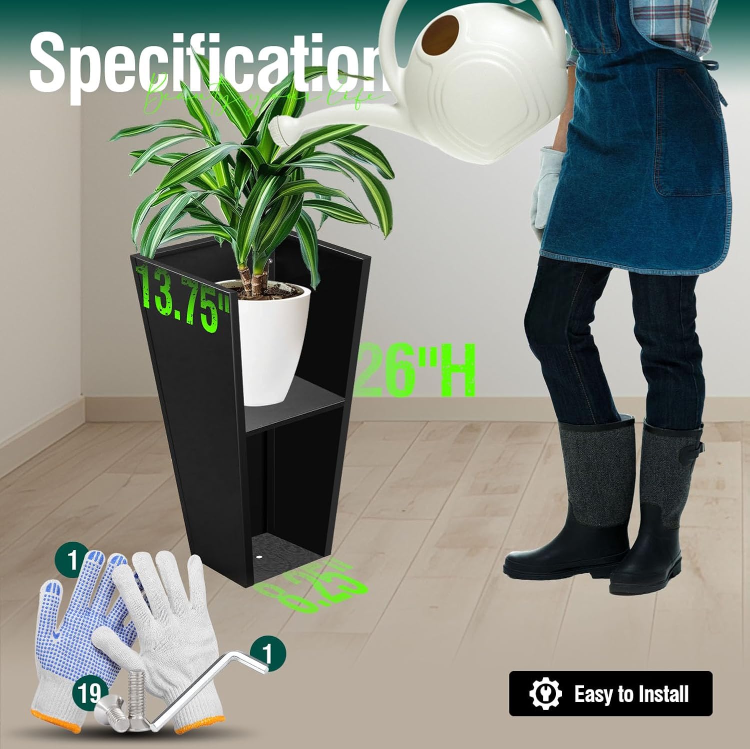 - Tall Black Planters for Front Porch: Size: 13.75”L x 8.25”W x 26”H. Easy to Install. Package: 4 sides and a bottom surface with a drainage hole, a detachable shelf with a drainage hole, a installation Manual, a Allen wrench, screws, gloves x 1