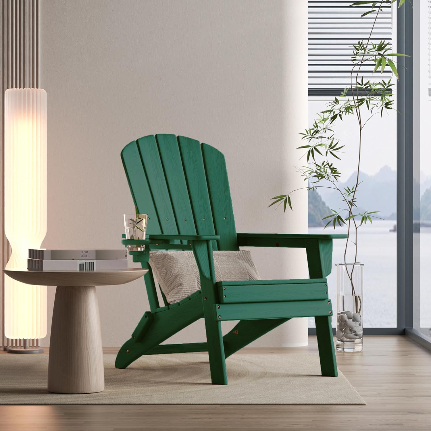 Folding Adirondack Chair - Extended Ergonomic Backrest, Cup Holder - Easy Assembly - Durable HDPE Plastic, Weather Resistant & Maintenance-Free - Lawn, Patio, Deck Supports 400lbs Green
