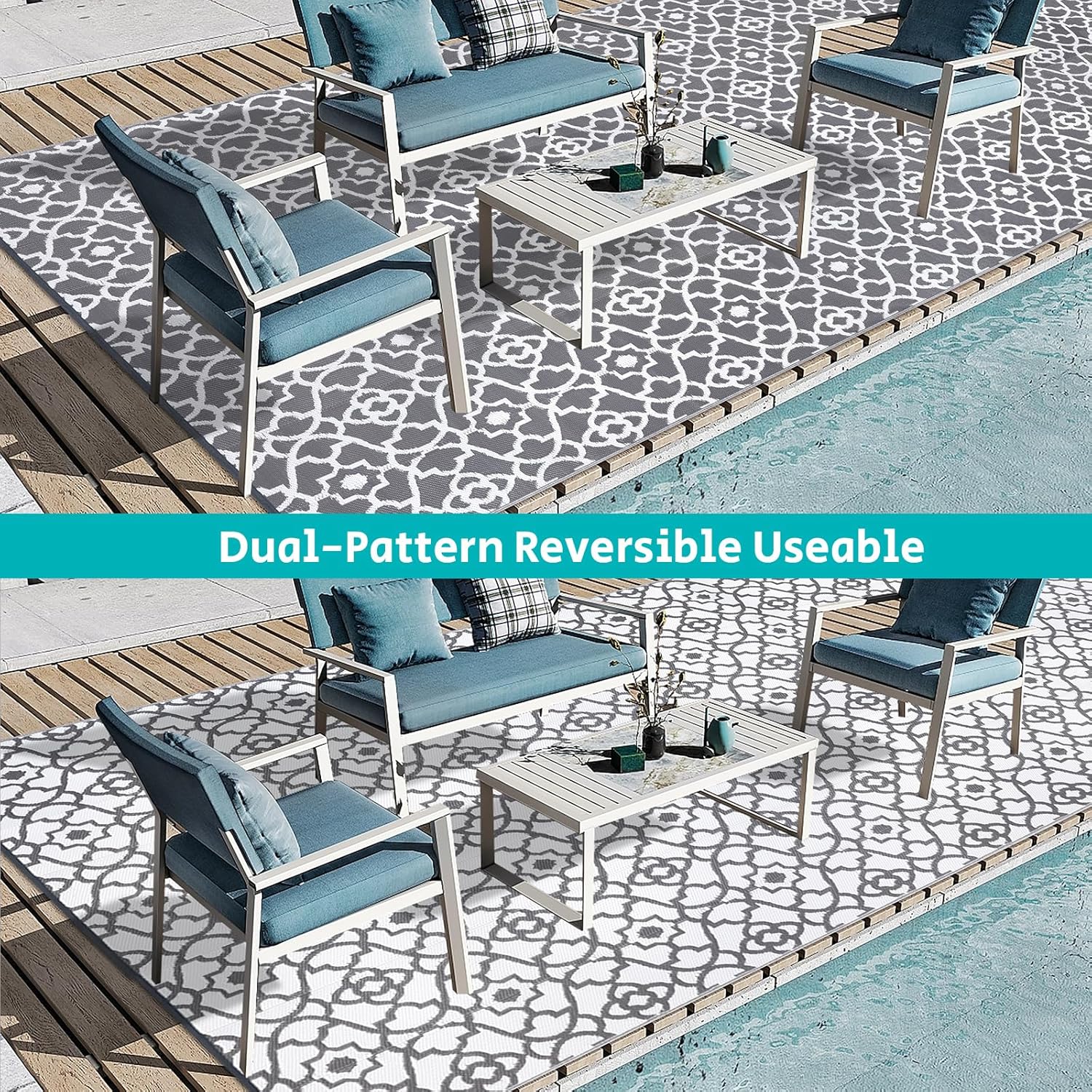 - XXXXL Large Reversible Outdoor Rugs: Featuring a classic moroccan pattern on both sides, this rectangular 9x18 ft outdoor area rug allows you to instantly refresh your patio, porch, backyard, deck, RV campsite. And this outdoor deck rug is reversible, two-sided design allows you to have two different looks,both sides can blend perfectly with nature and look very full and comfortable.
