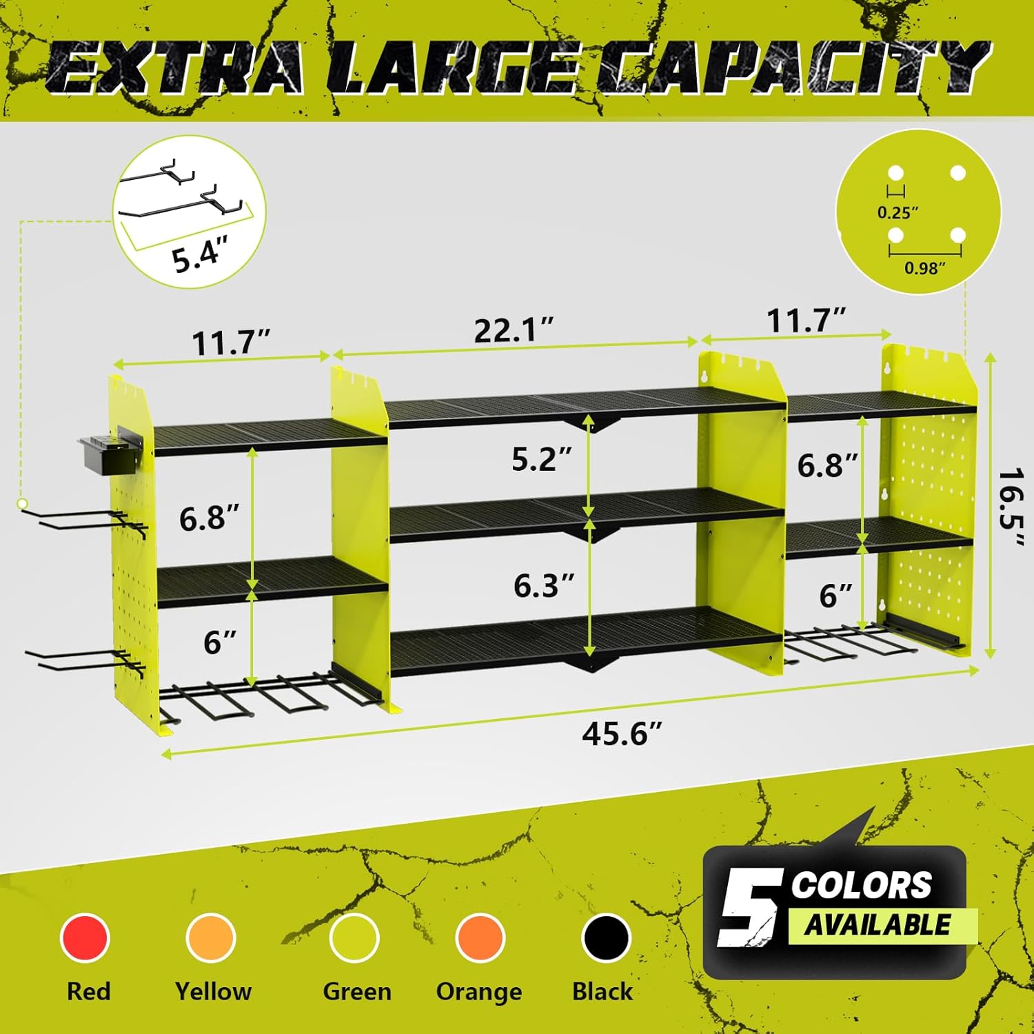 - Versatile Garage Storage Rack: The top shelf holds heavy-duty tools like electric and miter saws, while the middle and lower shelves fit medium-sized items like chargers, batteries, and toolboxes. The 5.4-inch side pegboard hooks keep hammers and screwdrivers organized and accessible. This wall-mounted garage organization saves floor space, transforming a cluttered area into an organized workspace. Note: Tools shown are for display only and are not included