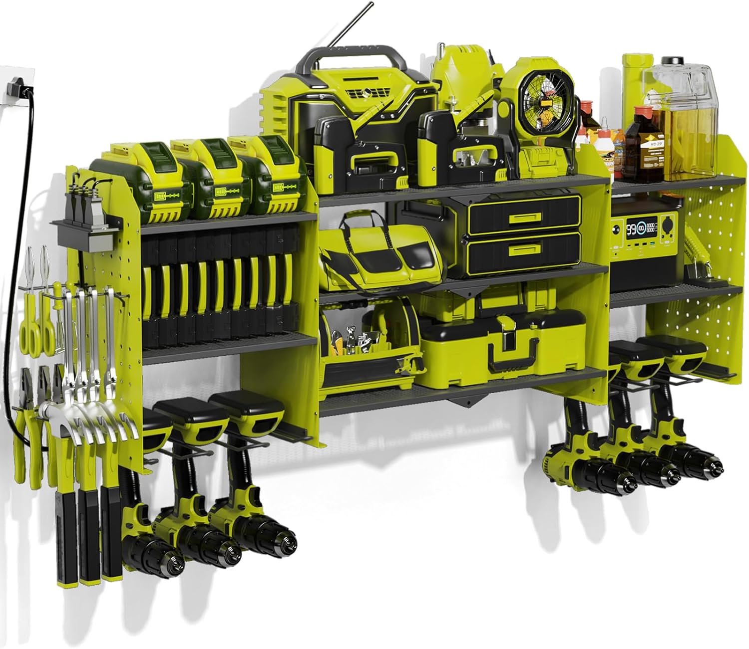 - Expanded Width to Maximized Storage: The Xankzi power tool organizer wall mount with charging station features a patented wide design in its 2 central shelves, perfect for storing more tools, especially longer items like chainsaws. Measuring 45.6" wide, 16.5" high, and 8.7" deep, this sturdy and space-efficient power tool storage rack keeps your tools organized