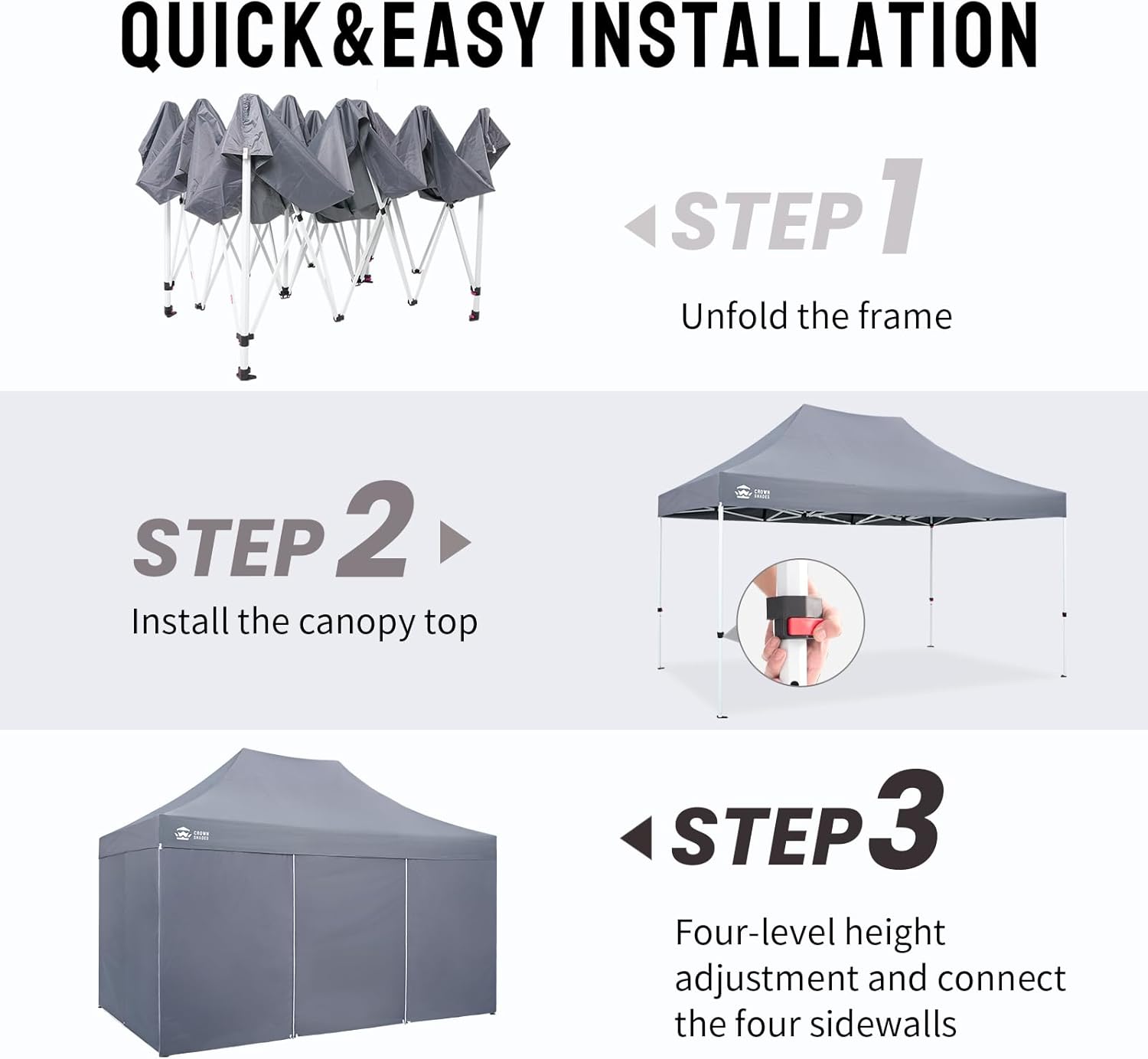 - QUICK POP-UP INSTALLATION: The outdoor pop-up canopy can be deployed in under five minutes. Simply extend the frame, secure the top cover of your easy-up canopy tent, adjust the height as necessary, and finalize the setup with stakes and ropes.