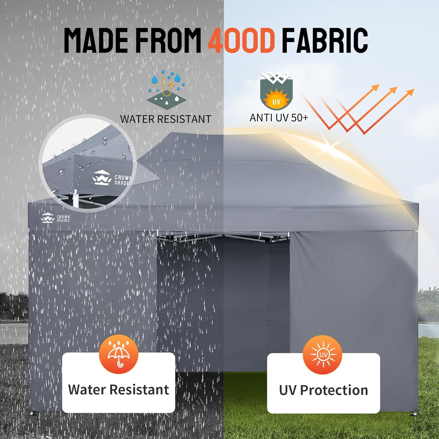 CROWN SHADES 10x15 Pop Up Canopy Tent, Thicken Frame Commercial Heavy Duty Tent with 4 Sidewalls 8 Stakes & 4 Sandbags & 4 Ropes, Outdoor Canopies for Events, Parties,Grey