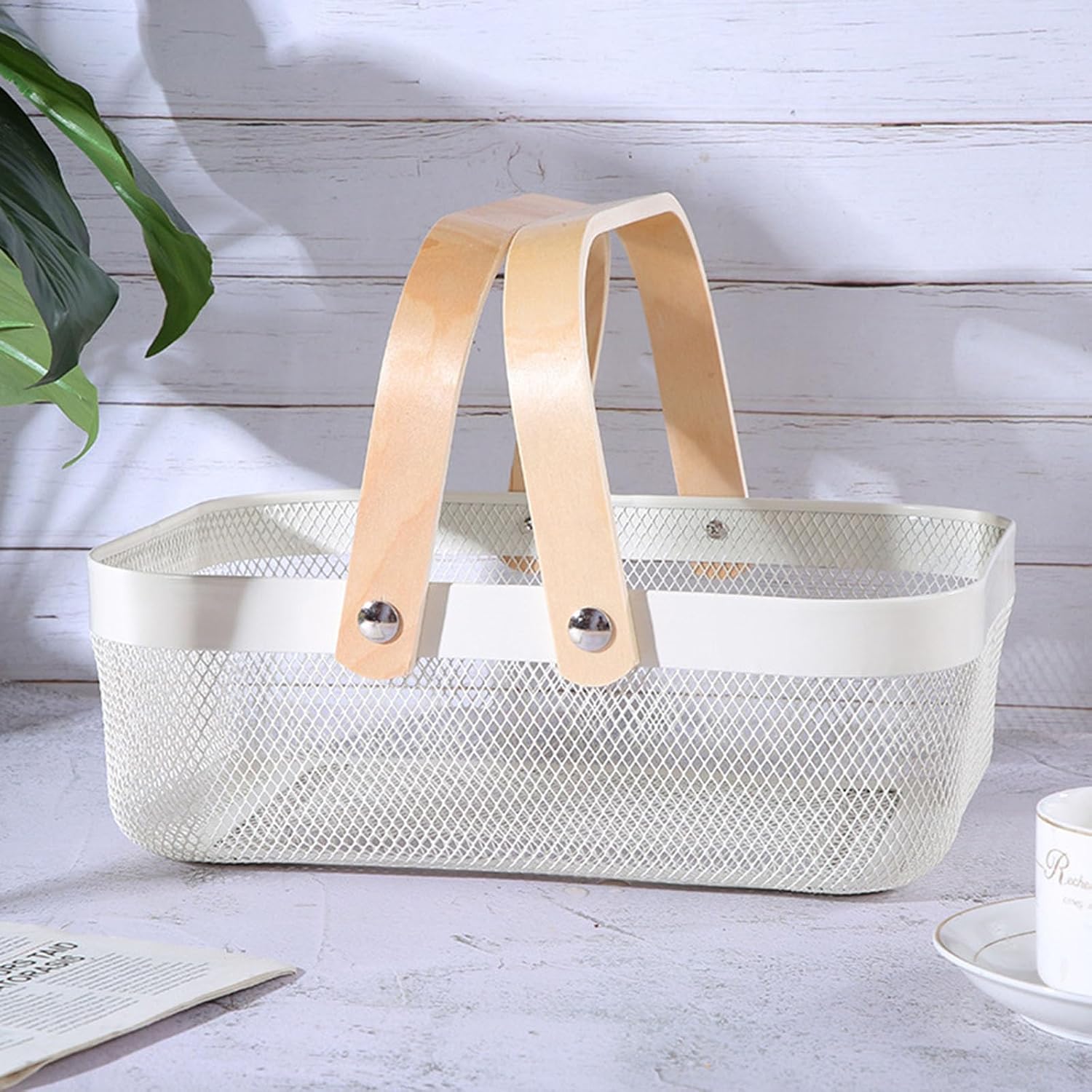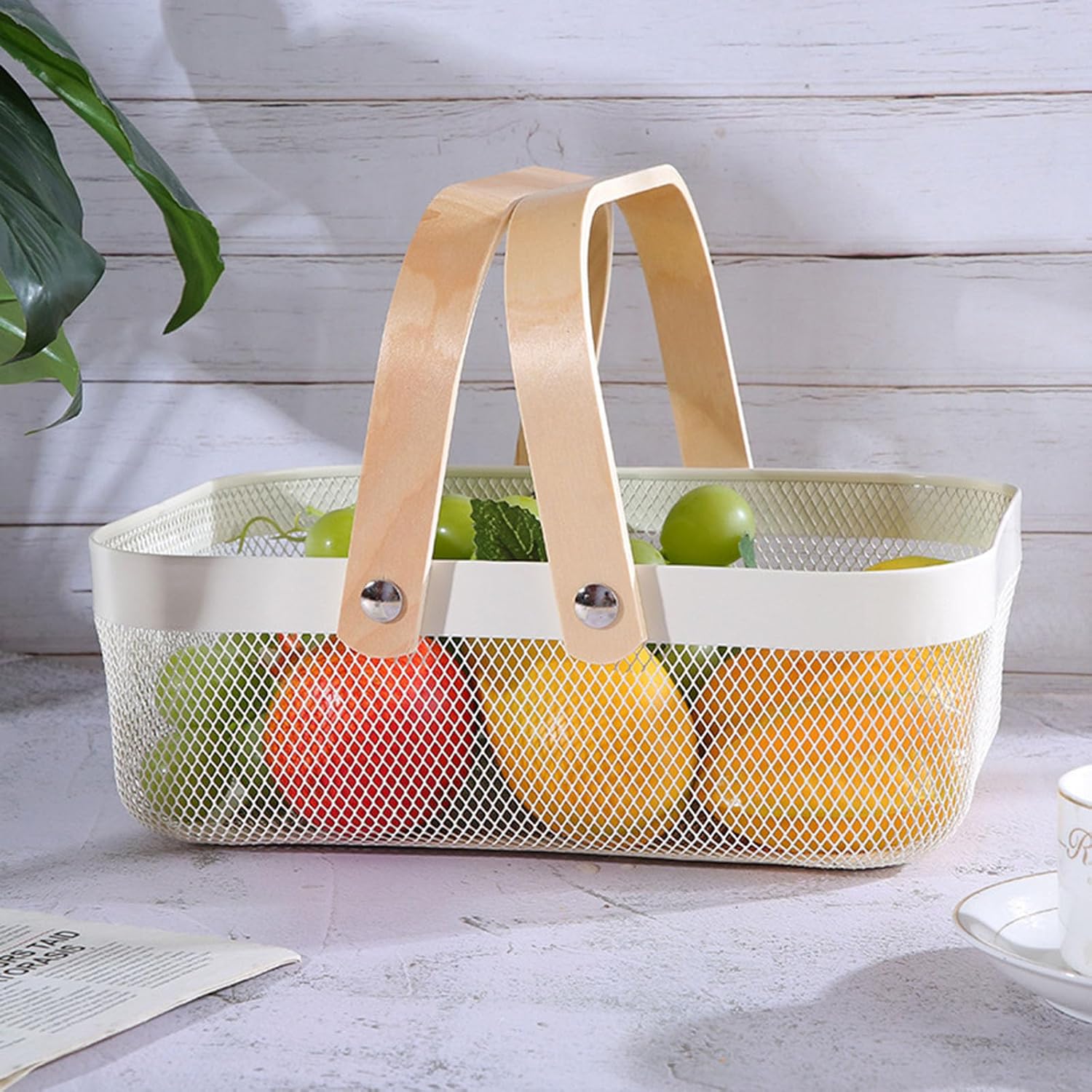 Metal Mesh Steel Basket, Storage Organizer Basket Garden Harvest Basket Multi-functional Kitchen Fruit Baskets Bin with Wooden Handle for Bathroom Picnic Shopping Decor Cabinet Home, White