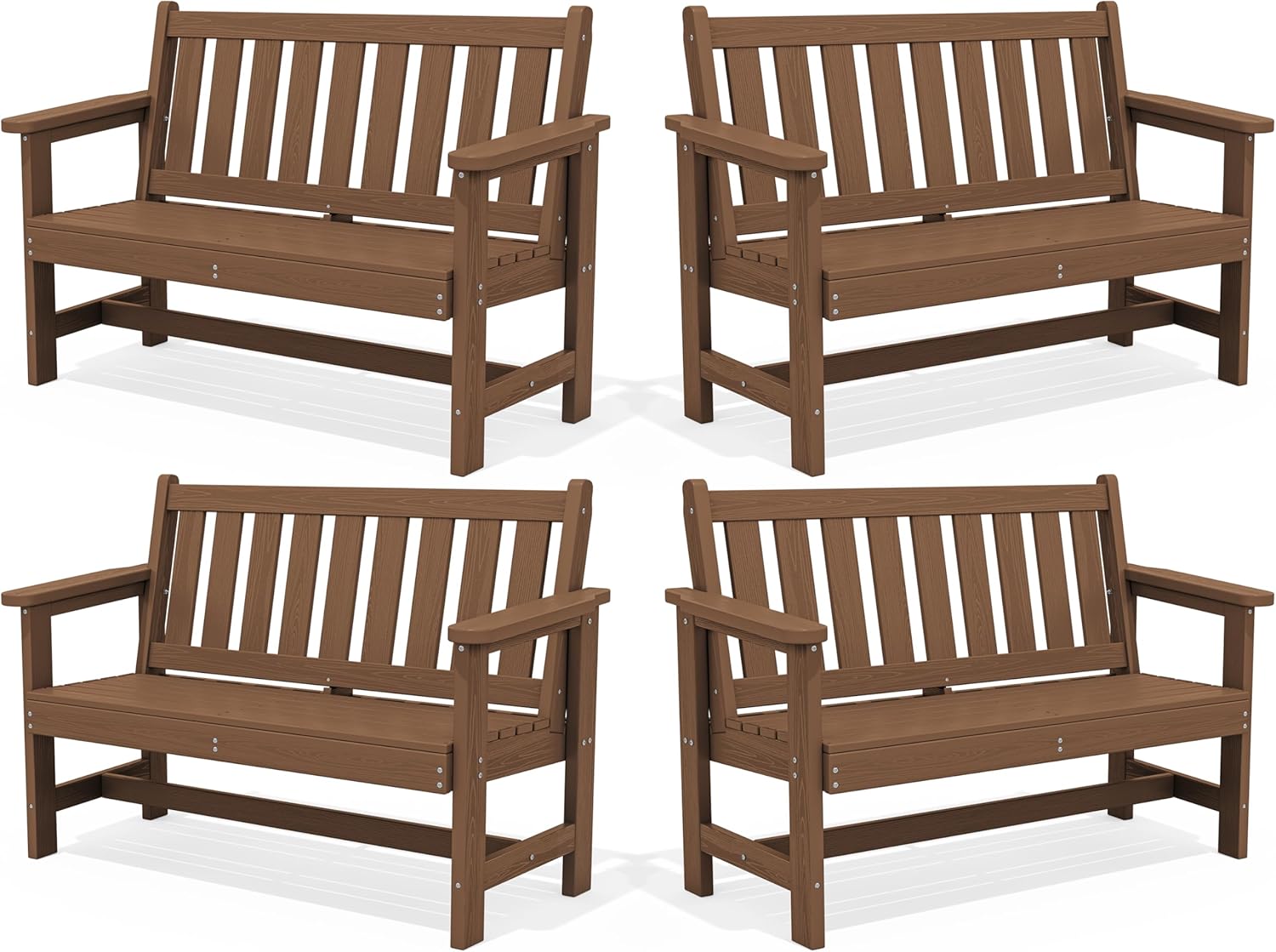 SERWALL Outdoor Bench, HDPE Outdoor Benches Weatherproof, 2-Person Garden Bench with 660 lbs Weight Capacity, Patio Benches for Outdoors, Garden, Porch, Backyard and Park, Brown, 4 Pack