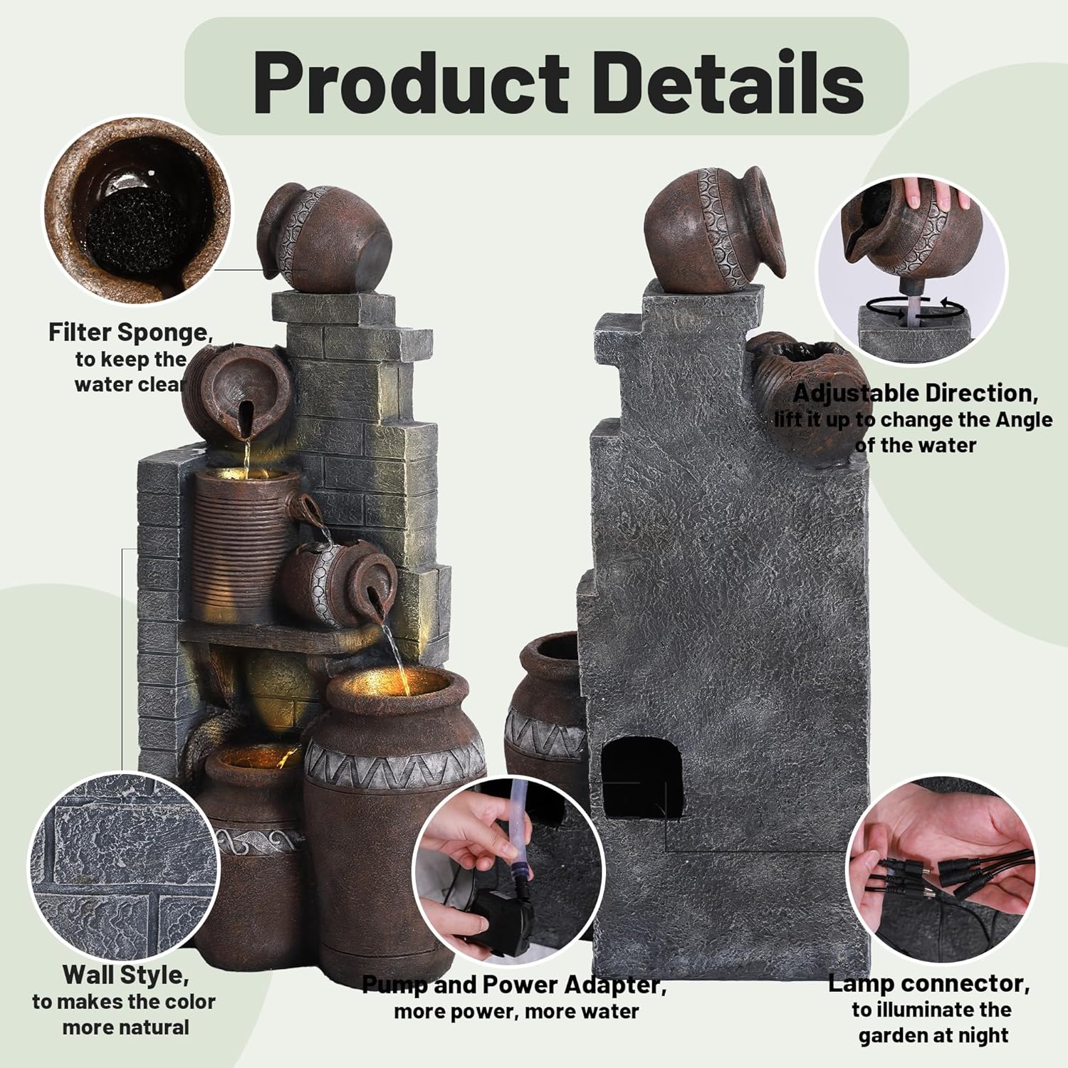- Safety and Convenience: This indoor/outdoor decorative fountain has officially UL listed and is designed with a American plug, 110V-120V 60Hz input voltage, and the pump's running speed can be adjusted. Only need to connect the pump and light to use it