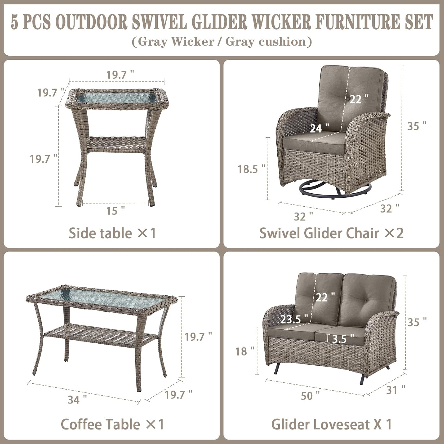 - Size : 5 PCS - Swivel Glider & Glider Loveseat