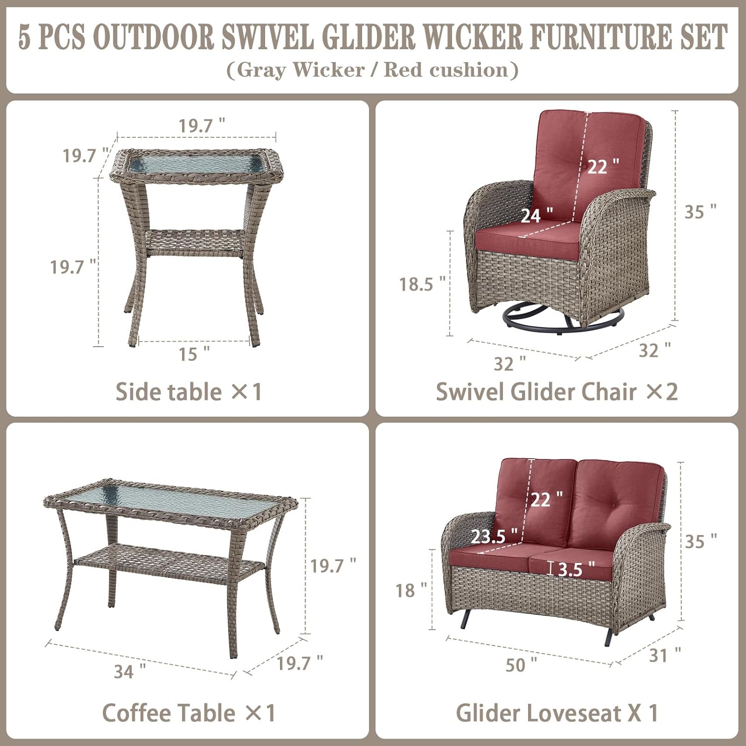 - Size : 5 PCS - Swivel Glider & Glider Loveseat