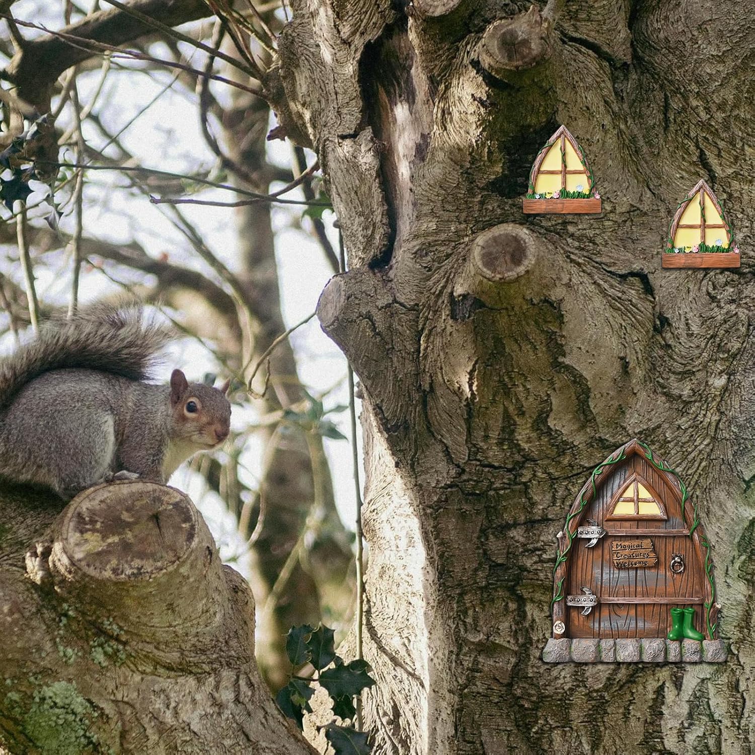 - Beautiful Painting:This outdoor fairy door and windows are beautifully hand-painted and carved with realistic details and decorated with flowers and tree vines, which can blend perfectly with the bottom of a tree or garden corner.And a pair of boots left behind by a careless elf.