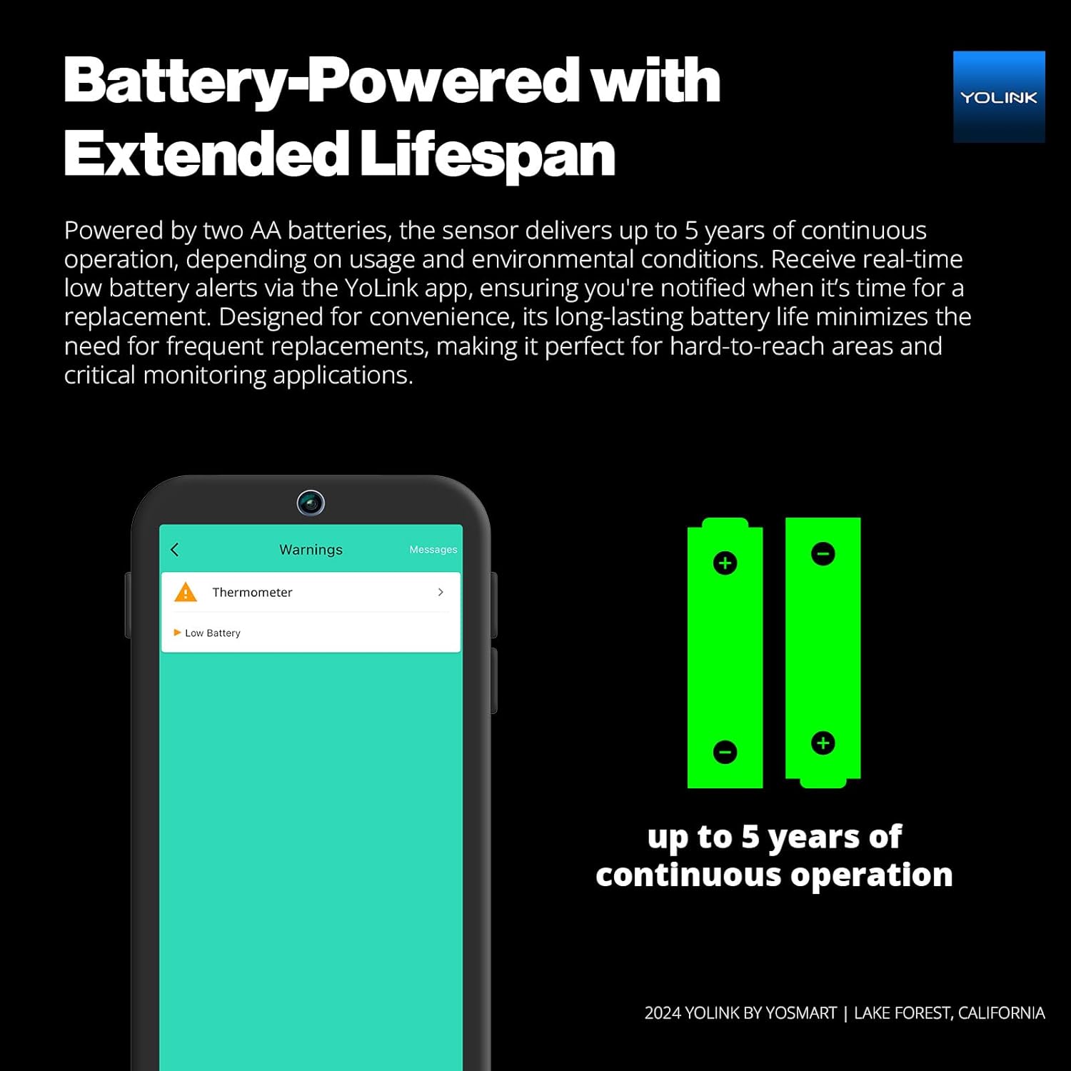 - Battery-Powered with Extended Lifespan: Powered by two AA batteries, the sensor delivers up to 5 years of continuous operation, depending on usage and environmental conditions. Receive real-time low battery alerts via the YoLink app, ensuring you're notified when it’s time for a replacement. Designed for convenience, its long-lasting battery life minimizes the need for frequent replacements, making it perfect for hard-to-reach areas and critical monitoring applications.