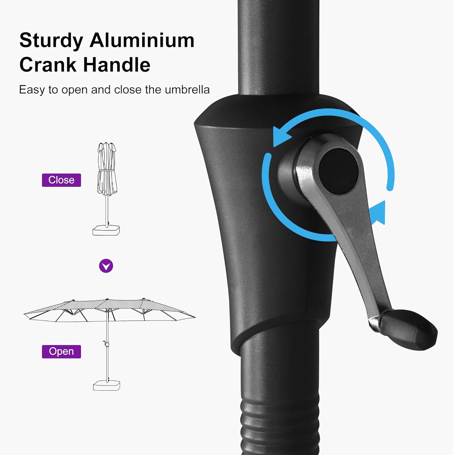 - Double-Sided Umbrella: This market patio umbrella provides up to 15 feet of coverage, offering shade for at least an 8-piece dining set. It is ideal for use in spacious patios, gardens, or by the poolside