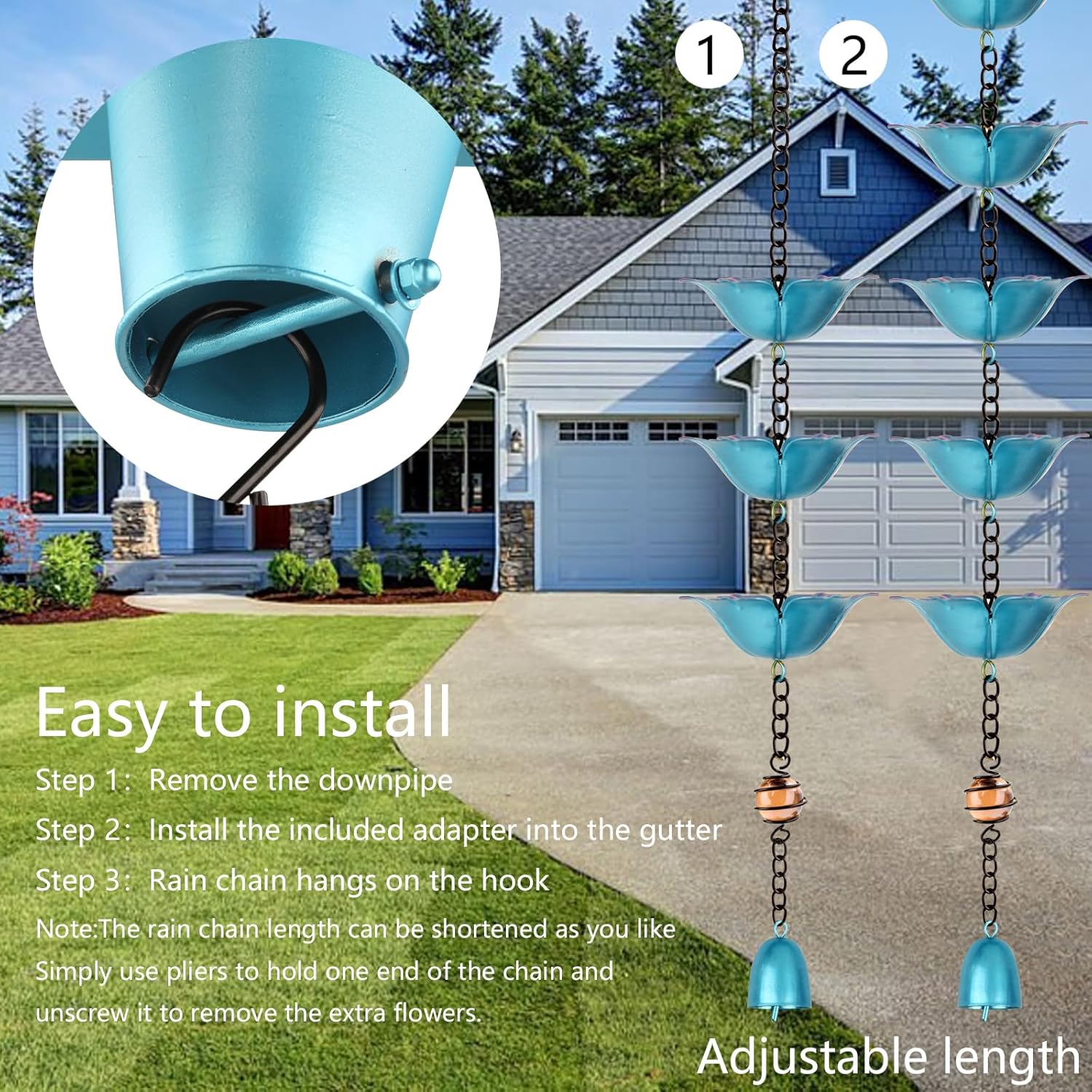 - PREMIUM QUALITY MATERIAL: The rain chain is made of durable iron material to ensure stability and durability in all weather conditions. Whether it's direct sunlight or rain, this rain chain will stand up to the elements and won't fade or break over time.