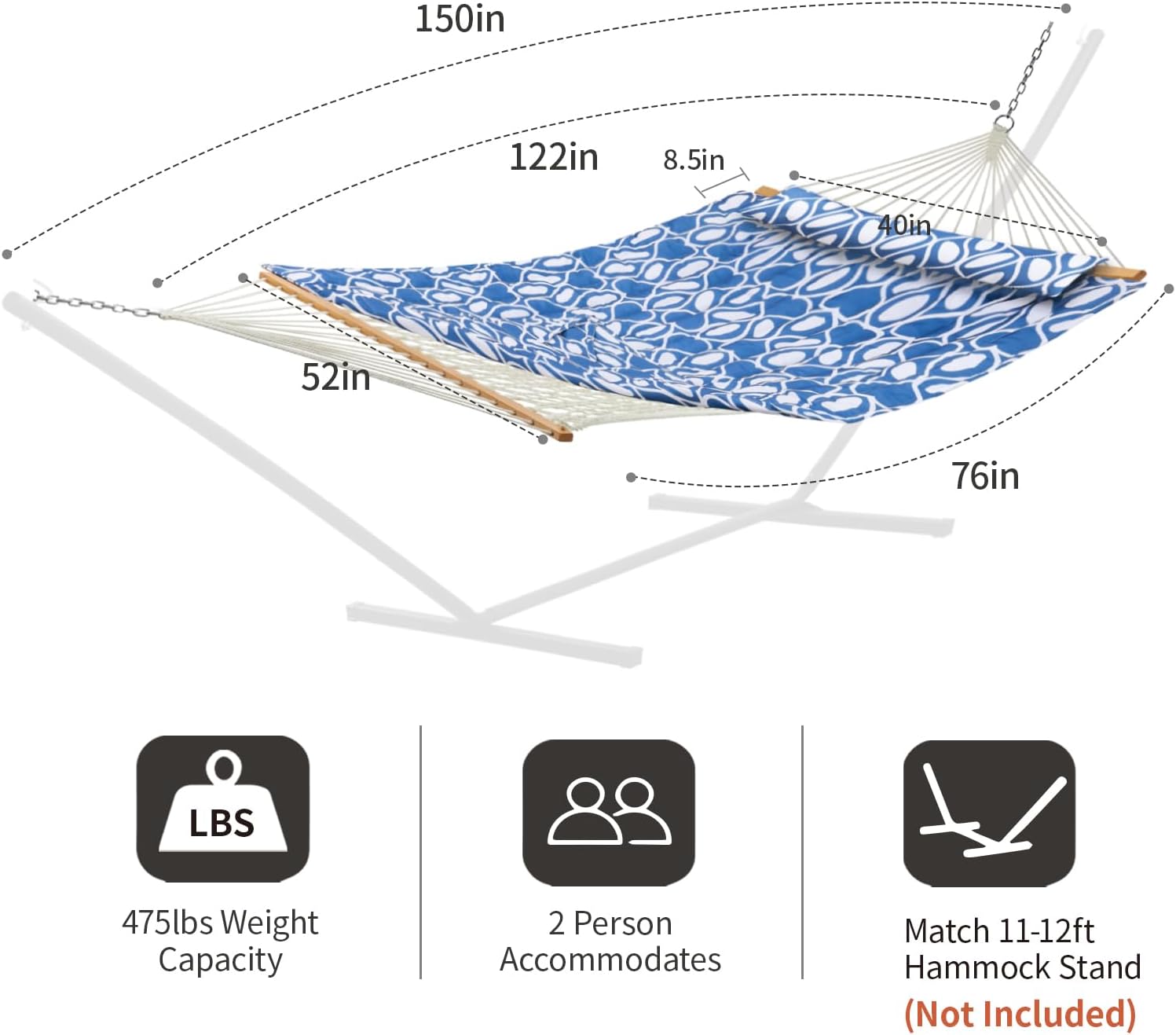 - Large 2 person Hammock: Rope hammock bed size: 76"L*52"W,hammock pad size:78"L* 55"W.Designed to support up to 475 lbs,the hammock fits 2 adults comfortably. It's time to share the hammock with your family.The ring-to-ring length is 122inches, equipped with two 14” metal chains, the maximum length of the rope hammock can be up to 150inches, fits 11-12ft hammock stand(not included).