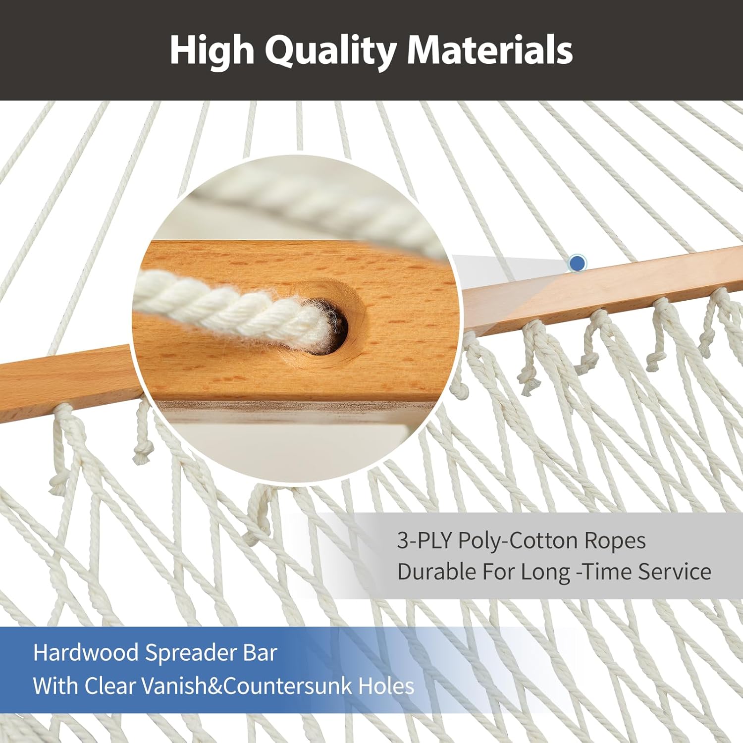 - Durable and high quality product: Our hammock are hand made by skilled hammock artisans.3-PLY 0.28" thick poly-cotton ropes is designed for maximum density. The hand woven hammock bed and double braided sides are perfect contour to have you feeling like you’re floating.With the hardwood spreader bars support,the hammock is safe and stable.Features countersunk holes that protect the ropes from friction.The 52" hardwood spreader bar is oil-rubbed finished for weather resistant and stability.