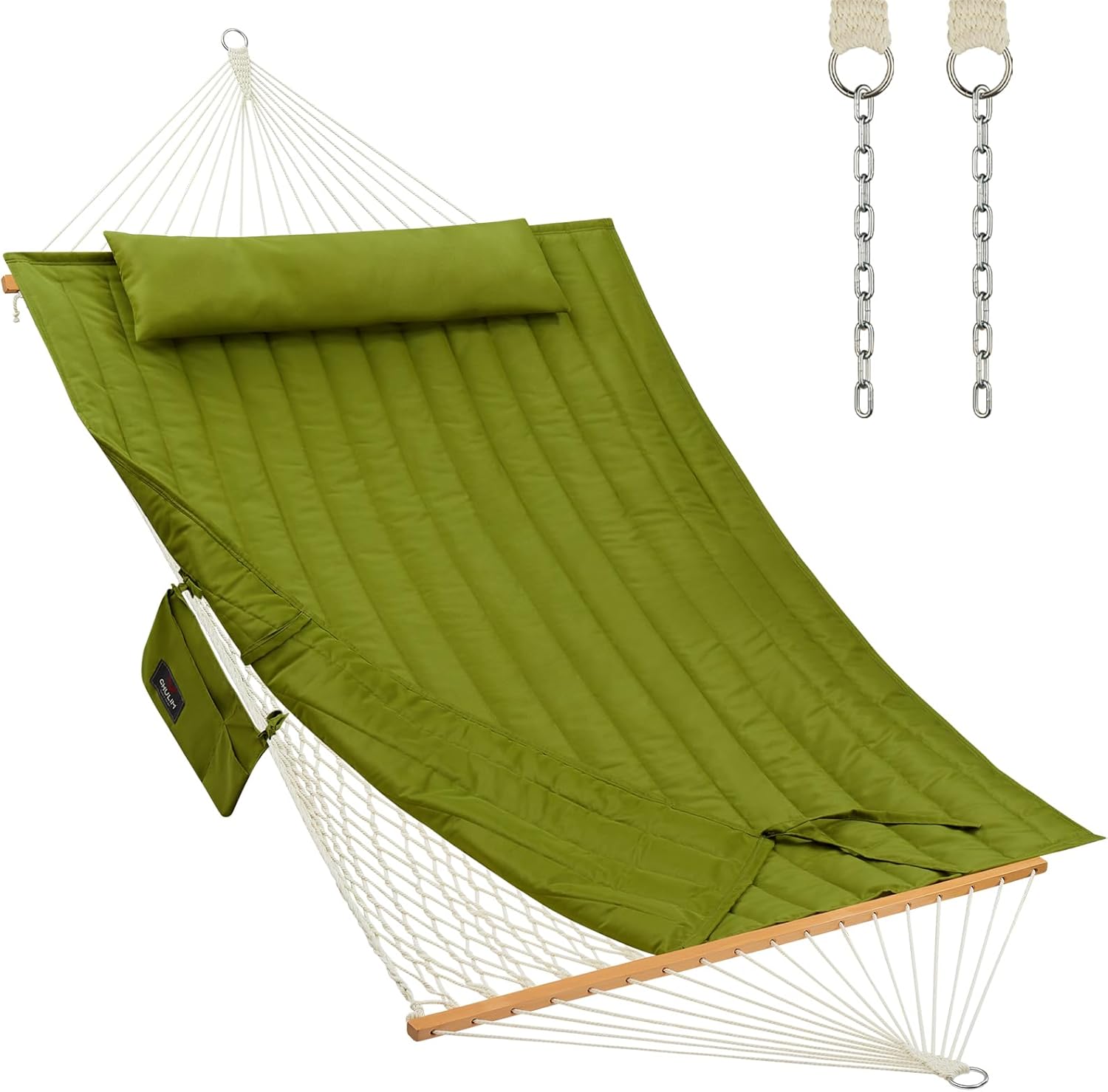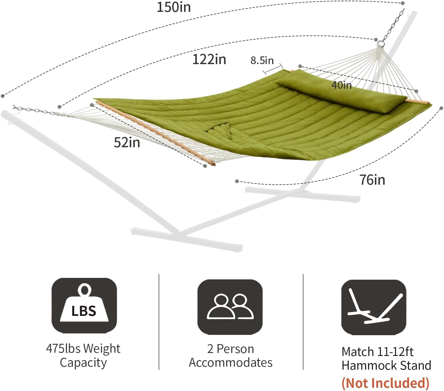 Outdoor Double Hammock with Hardwood Spreader Bars, Large Rope Hammock with Polyester Pad and Pillow, 475 LBS Capacity for 2 Person Patio Backyard Poolside - Green