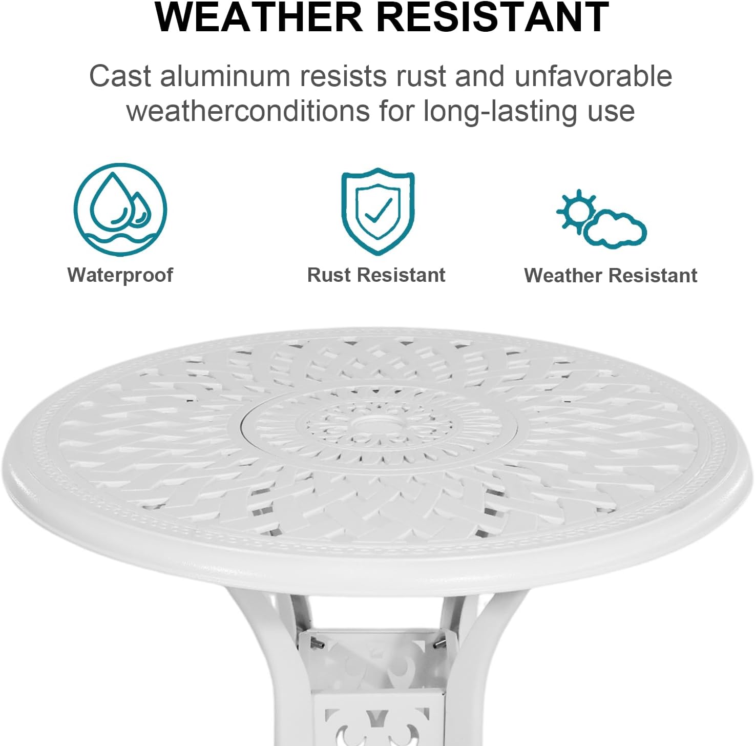 - Weather Resistant: This cafe table and chairs set with an anti-rust coating surface for all weather, no fading, no aging.Chair's weight capacity is up to 400 lbs.