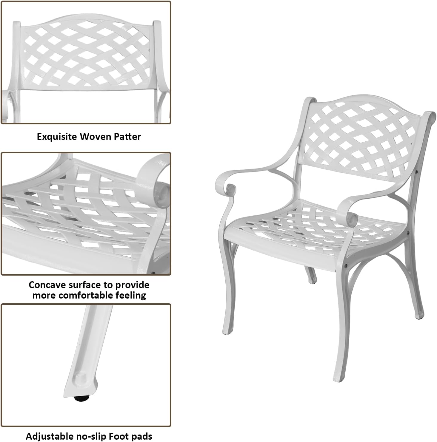 - Ergonomic Design: Ergonomic back and concave seat provide excellent support for your lumbar and back to lie down, and curved armrests give arms space to rest on. Simple and modern design of outdoor bistro table and chairs set goes well with any outdoor environments.
