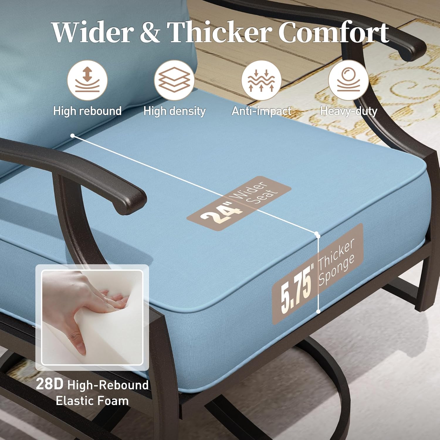 - LUXURIOUS 5.75" EXTRA THICKER CUSHION: This metal patio rocker chairs comes with a 5.75-inch extra thick soft cushion filled with 28D density sponge with high resilience for comfortable sitting. Enjoy a comfortable ride even if you use it for a long time, and say goodbye to the worries of collapsing seat cushion