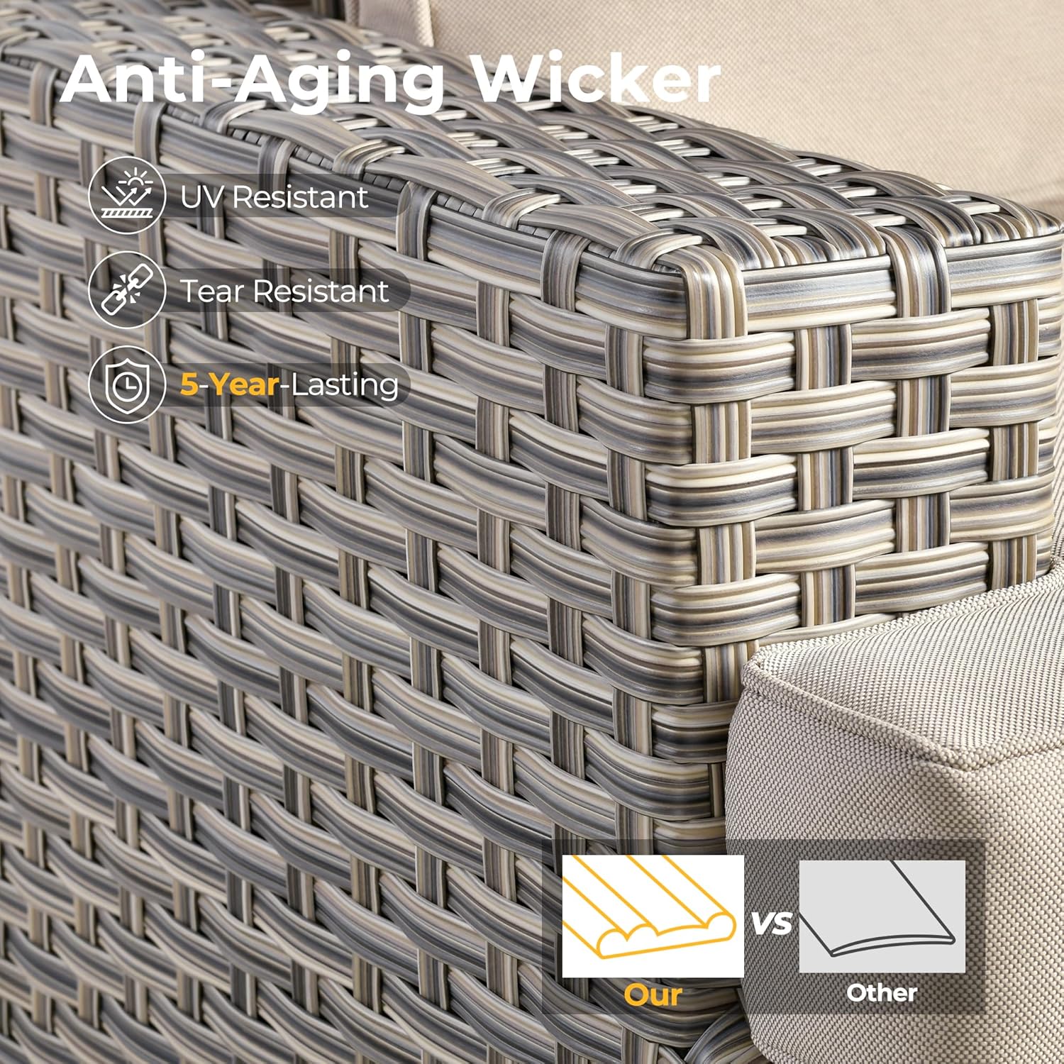 - All Weather & Durable: Selected anti-ageing treated thicken PE wicker rattan for UV resistant, wear resistant and all weatherproof. 3D strengthen and widen design for extended service life,twice service life as others