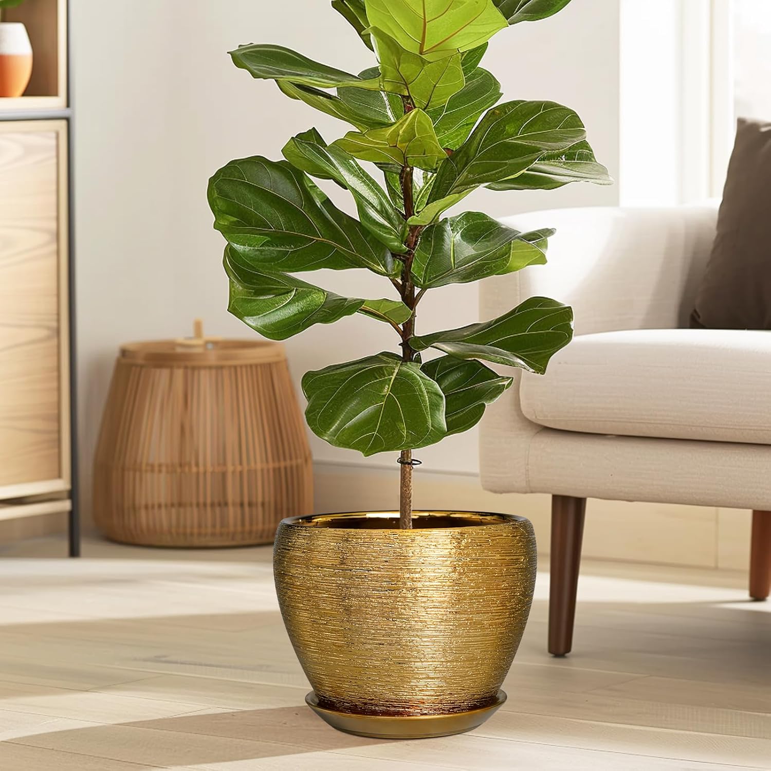 Ceramic Plant Pot 8 Inch - Planter for Outdoor Plants Indoor Plant Pot with Drainage Hole and Saucer Decorative Round Planter Modern Flower Pot for House Decor Gold
