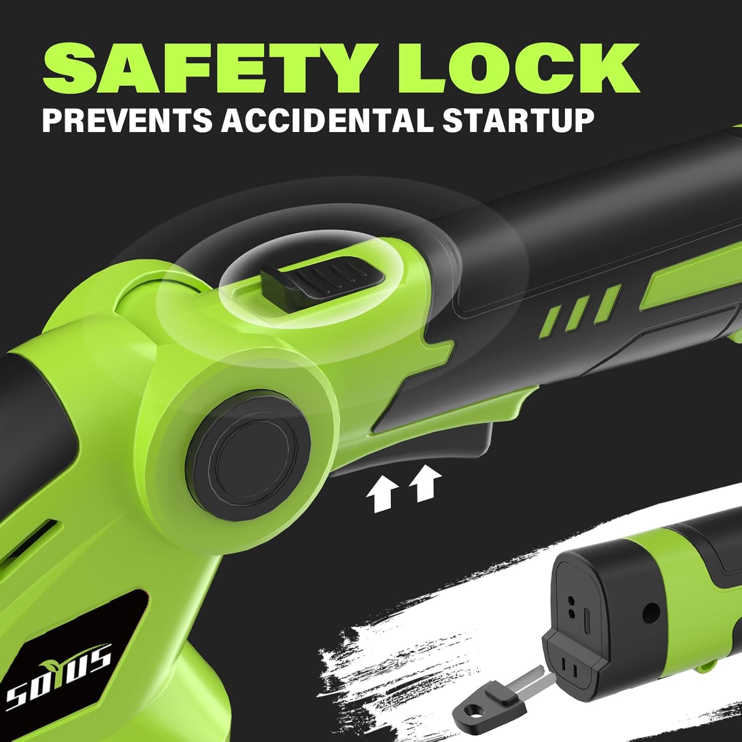 - **Safety First**: Designed with triple safety protection, the SOYUS grass trimmer requires the insertion of a safety key and simultaneous pressing of two buttons to ensure safe operation, prioritizing user safety during use.