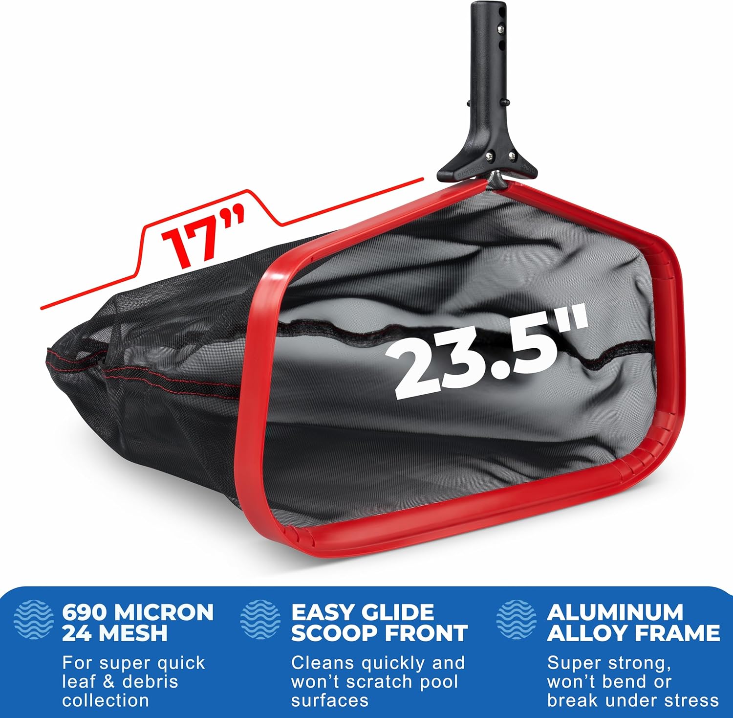 - DEEP BAG FOR FEWER PASSES – Our pool leaf net holds more debris per scoop, reducing cleaning time. Its 19.5" wide-mouth frame and deep mesh bag ensure fast, efficient skimming. Whether tackling wet leaves or heavy buildup, this pool scoop net helps you clean more in fewer passes.