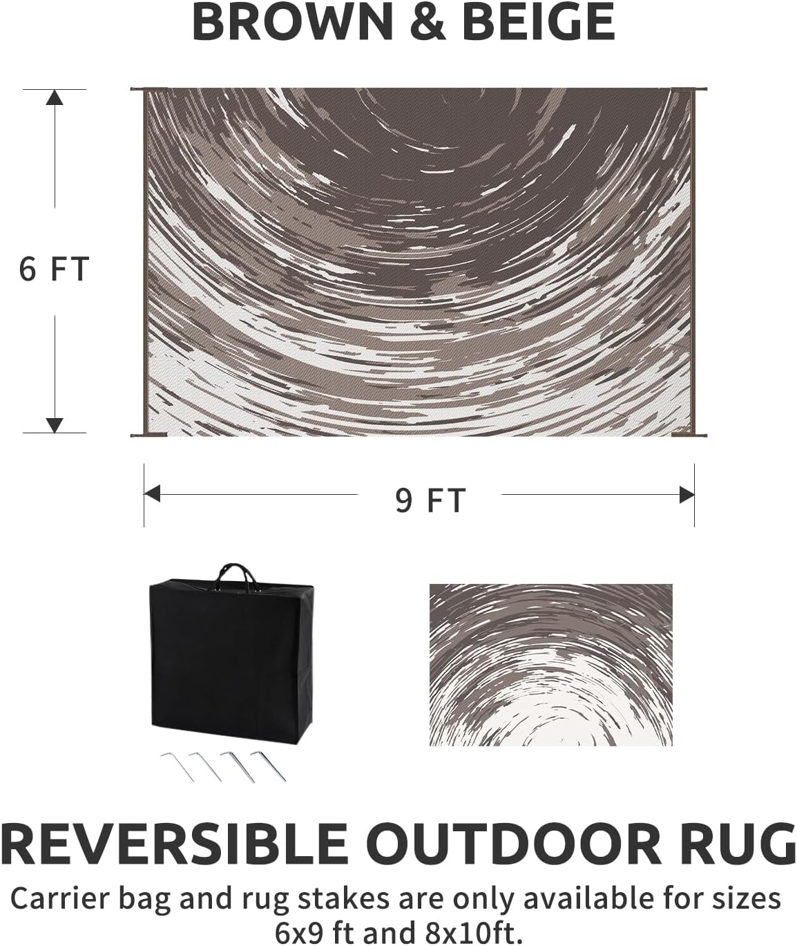 - RV traval&Camping: This camper must haves outdoor rug is ideal for picnics, gatherings, and RV trips! The lightweight outdoor camping carpet with foldable lines is easy to carry and saves space. Includes an extra carry bag and rug stakes for 6x9 ft, 8x10 ft and 9x12 ft. Grass-friendly, durable, and easy to clean, this outdoor rug enhances outdoor adventures.