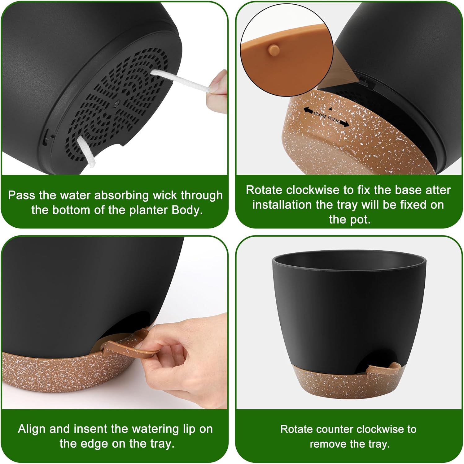 Plant Pots 10/9/8/7.5/7 Inch Self Watering Pots, Set of 5 Plastic Planters with Drainage Holes and Saucers,Plastic Flower Pots,Nursery Planting Pot for Indoor Out Door Plants(Black Brown)