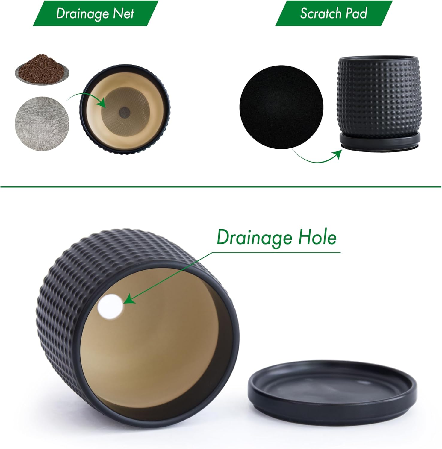 D'vine Dev Set of 2 Ceramic Plants Pots, 4 Inch Beaded Stoneware Flower Pot for Plants with Drainage Hole and Saucer, Ebony Matte, 27-E-Z-6