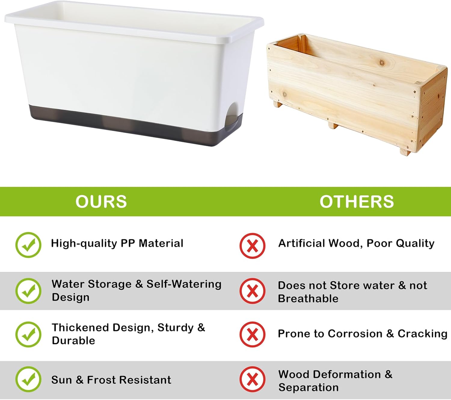 - 【Premium & Durable】The planter pots are made of high quality PP material and has been thickened to bear up to 300KG (660LB). This window box planter is sturdy, wear-resistant and durable. It can be exposed to light, wind, and sunlight for long periods of time, with a lifespan of decades. It is an excellent planter box for both indoor and outdoor.
