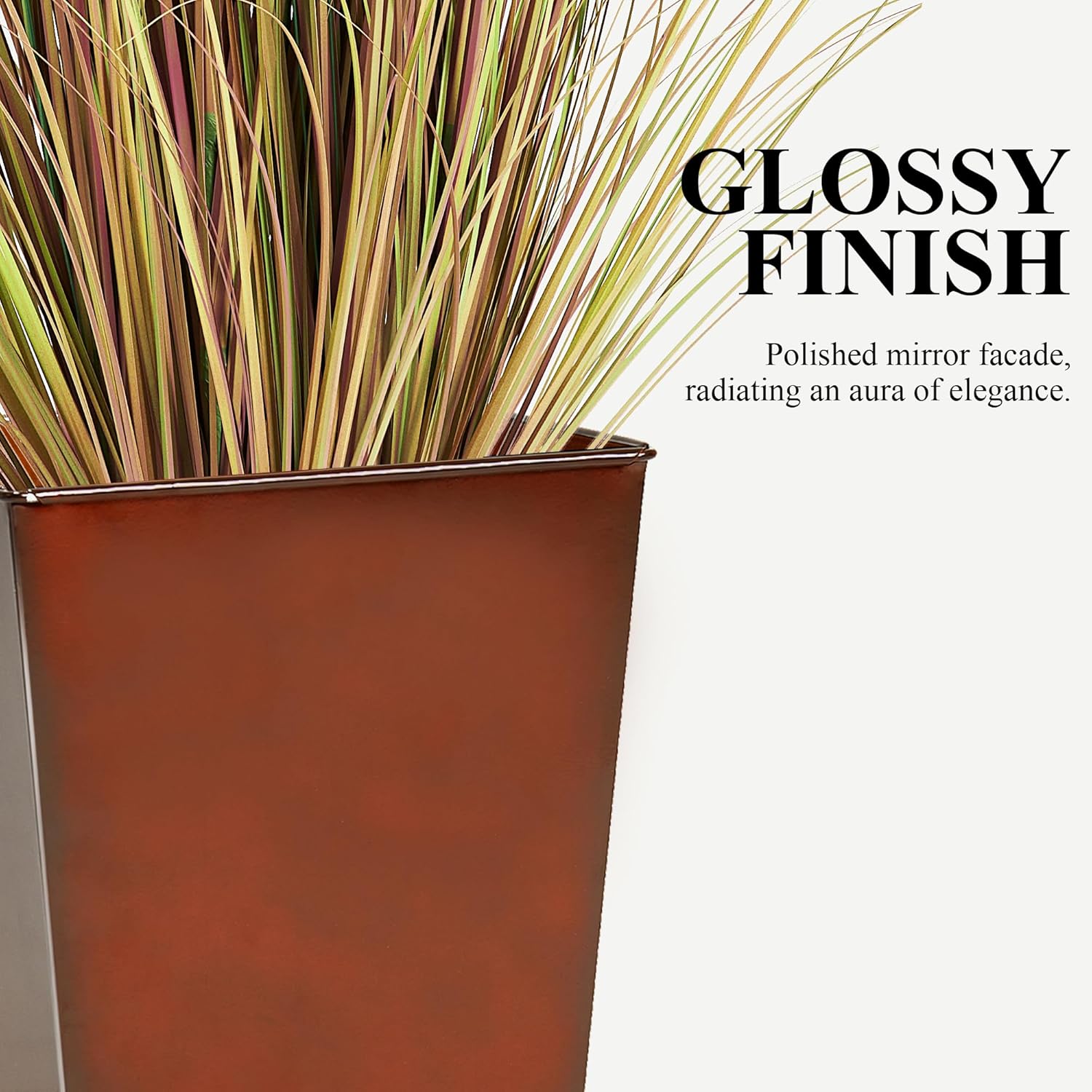 WORTH Garden 25" Large Metal Glazed Planter Set of 2, Luxurious Glossy Finish Red Tall Square Tapered Steel Plant Pots, Decor Flower Pot Indoor & Outdoor, Drainage Hole & Dual-Purpose Plant Saucer