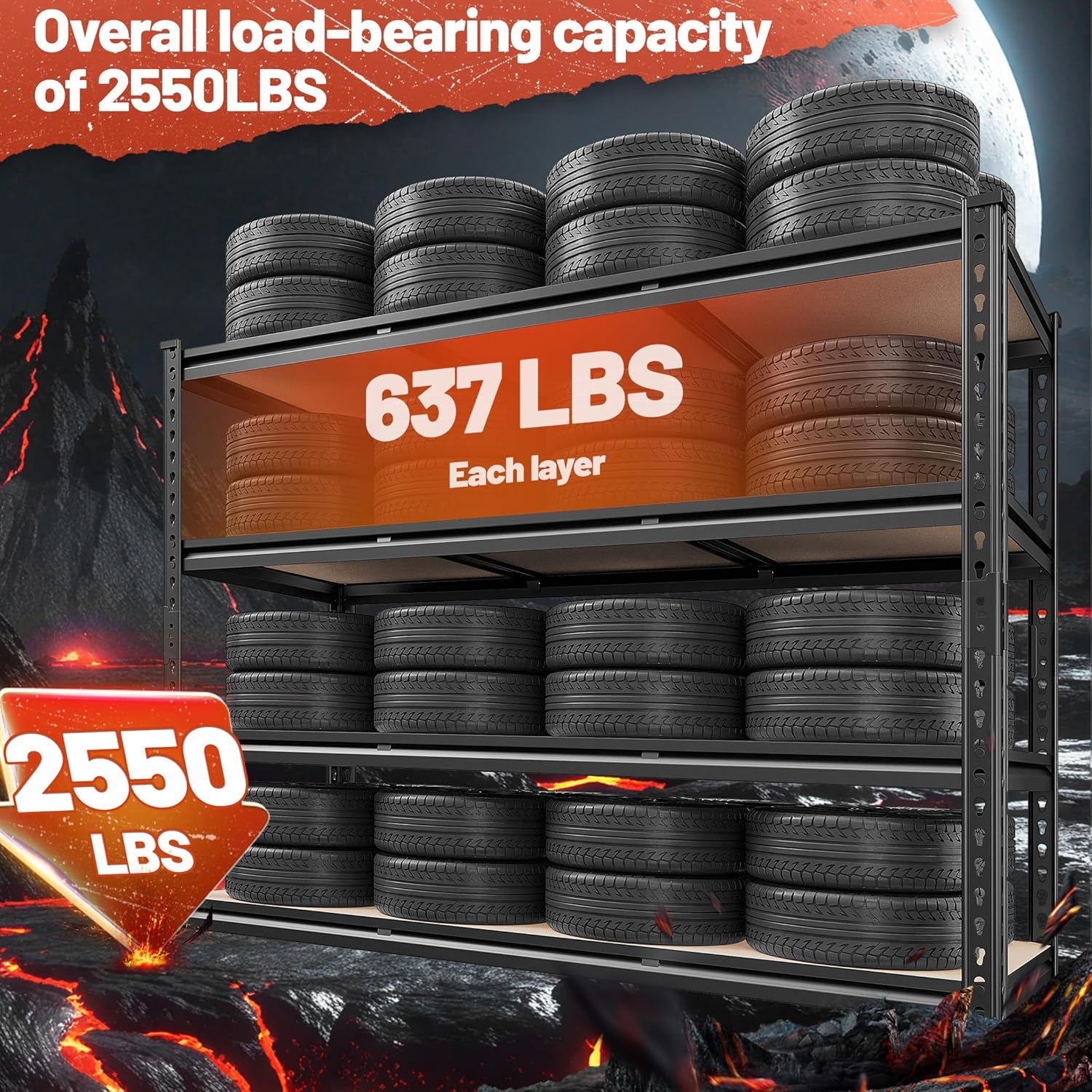 - 【2550LBS Capacity Garage Shelving】This garage shelving is made of heavy duty metal. The rolled edge thickened column effectively protects your hands, and the thickened design makes the load-bearing better, ensuring the single-layer load-bearing capacity of the garage shelf 637LBS and the total load-bearing capacity of 2550LBS. It is suitable for garage, workplaces, warehouse, living room, kitchen, to store camping equipment, tools, kitchen supplies